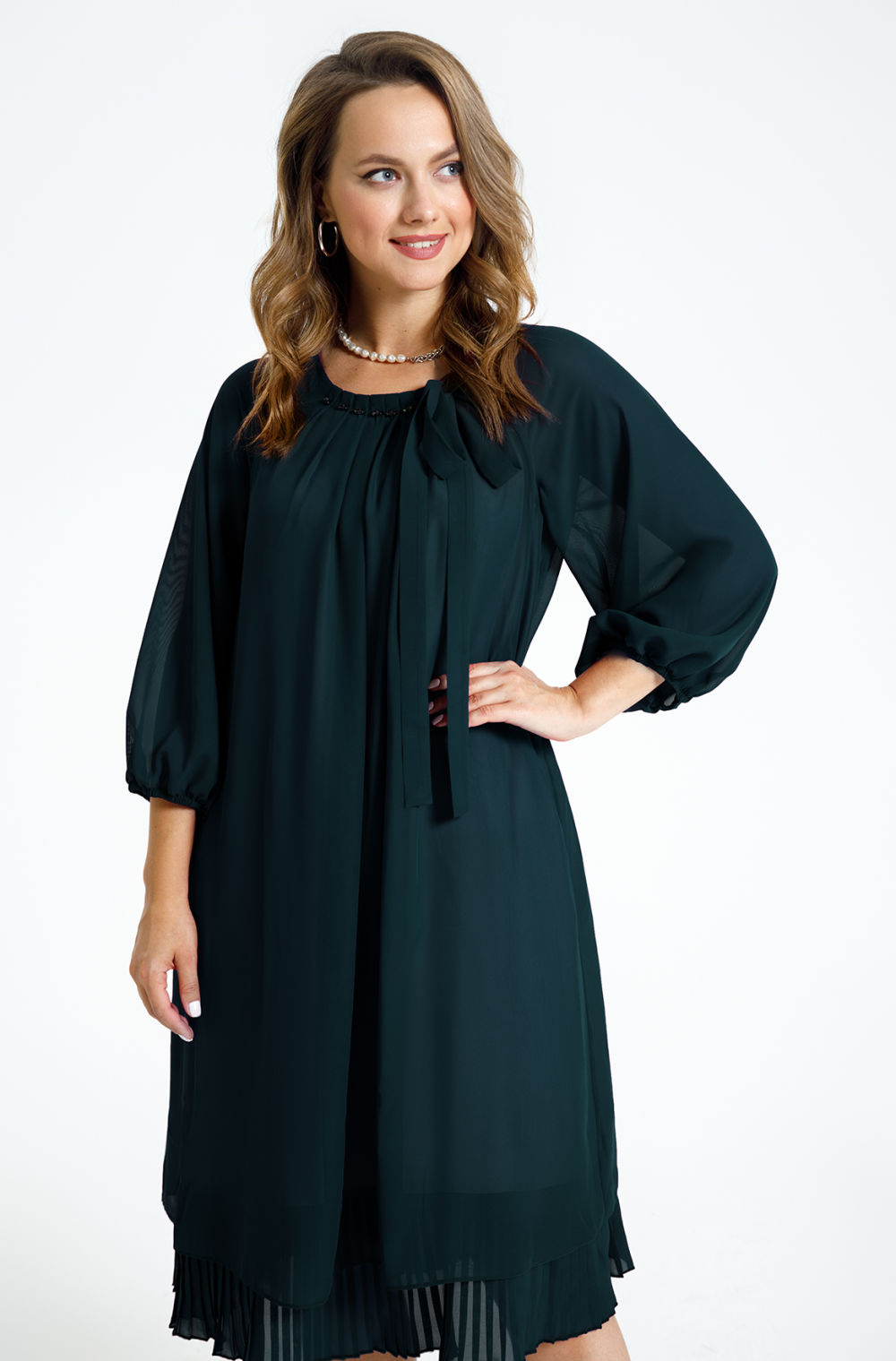 Нарядное платье трапециевидного силуэта с рукавом реглан. Рукав прямой, низ на резинке.  Низ платья оформлен рюшей из плиссированной ткани. Вырез горловины круглый  с заложенными вокруг нее складками, декорирован завязывающимся бантом и пришивными стразами. Платье выполнено на подкладке.