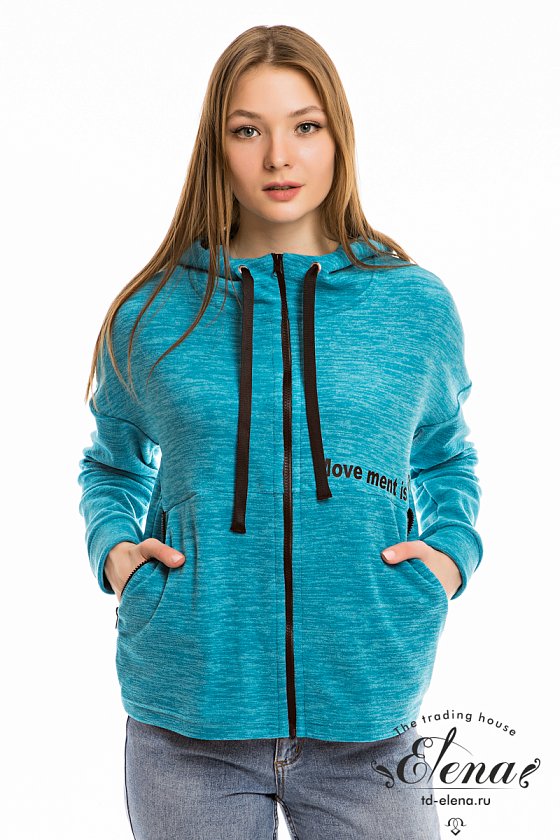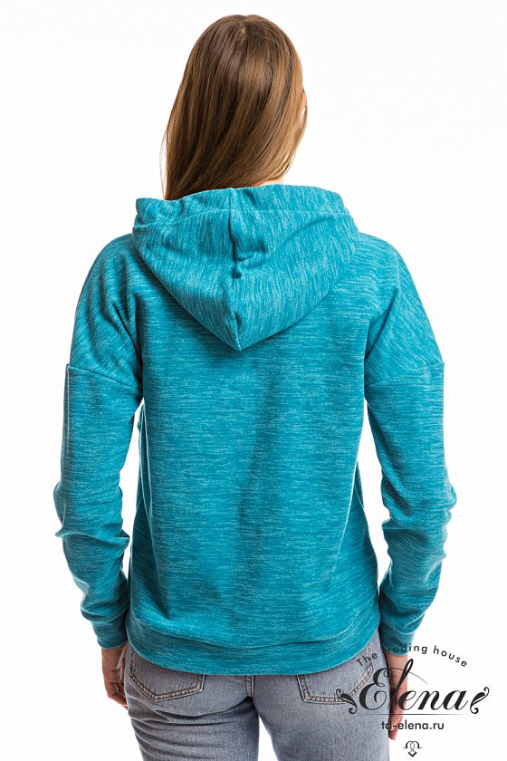 Толстовка с капюшоном выполнена из поларфлиса. Спереди центральная застёжка на молнию, с левой стороны нанесена термопечать. Длинный, спущенный рукав на манжете. По бокам размещены карманы на молнии. К удлинённой спинке притачан пояс.