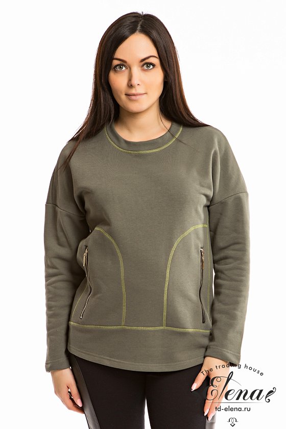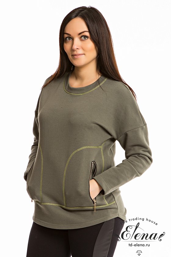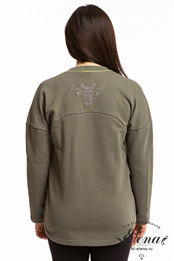 Толстовка выполнена из однотонного футера трёхнитки (воздушка) в цвете хаки. Горловина с круглым вырезом, рукава длинные, со спущенным плечом. Спереди размещены карманы с металлическими молниями. На спинке расположена вышивка.