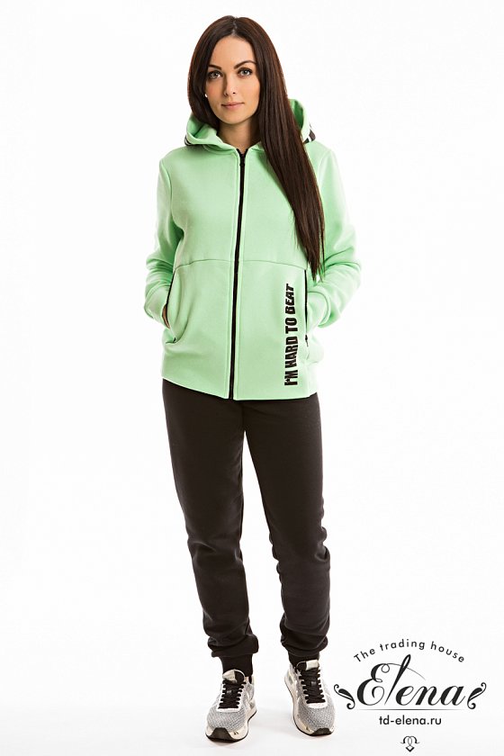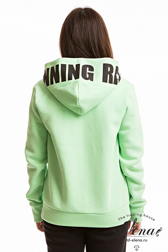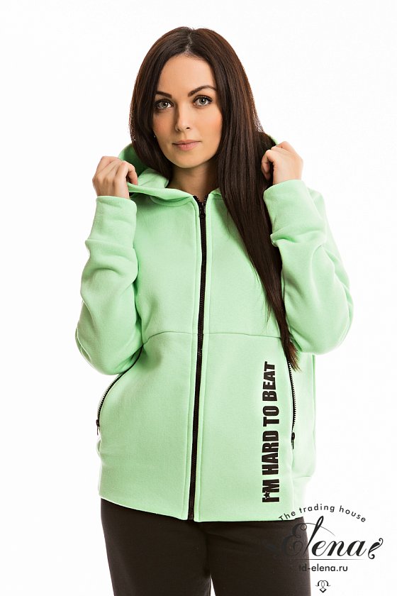 Толстовка выполнена из однотонного футера с начёсом. С капюшоном и центральной застёжкой на молнию. По бокам размещены карманы на молнии. Спереди и на капюшоне нанесён принт.