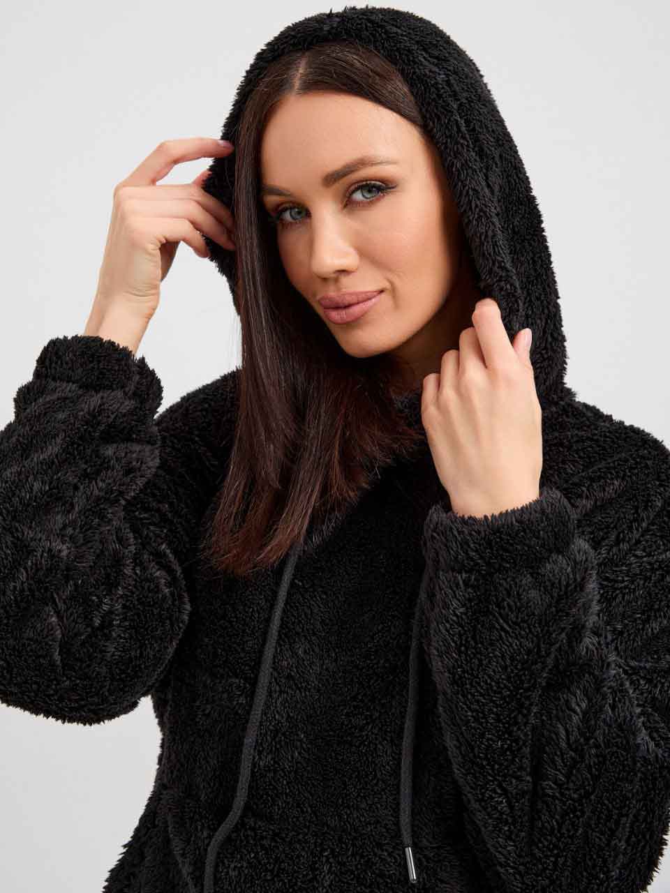Толстовка унисекс из искусственного меха, с втачными рукавами и капюшоном со шнурком. На полочке накладной карман-кенгуру. Низ рукавов и низ куртки с резинкой.