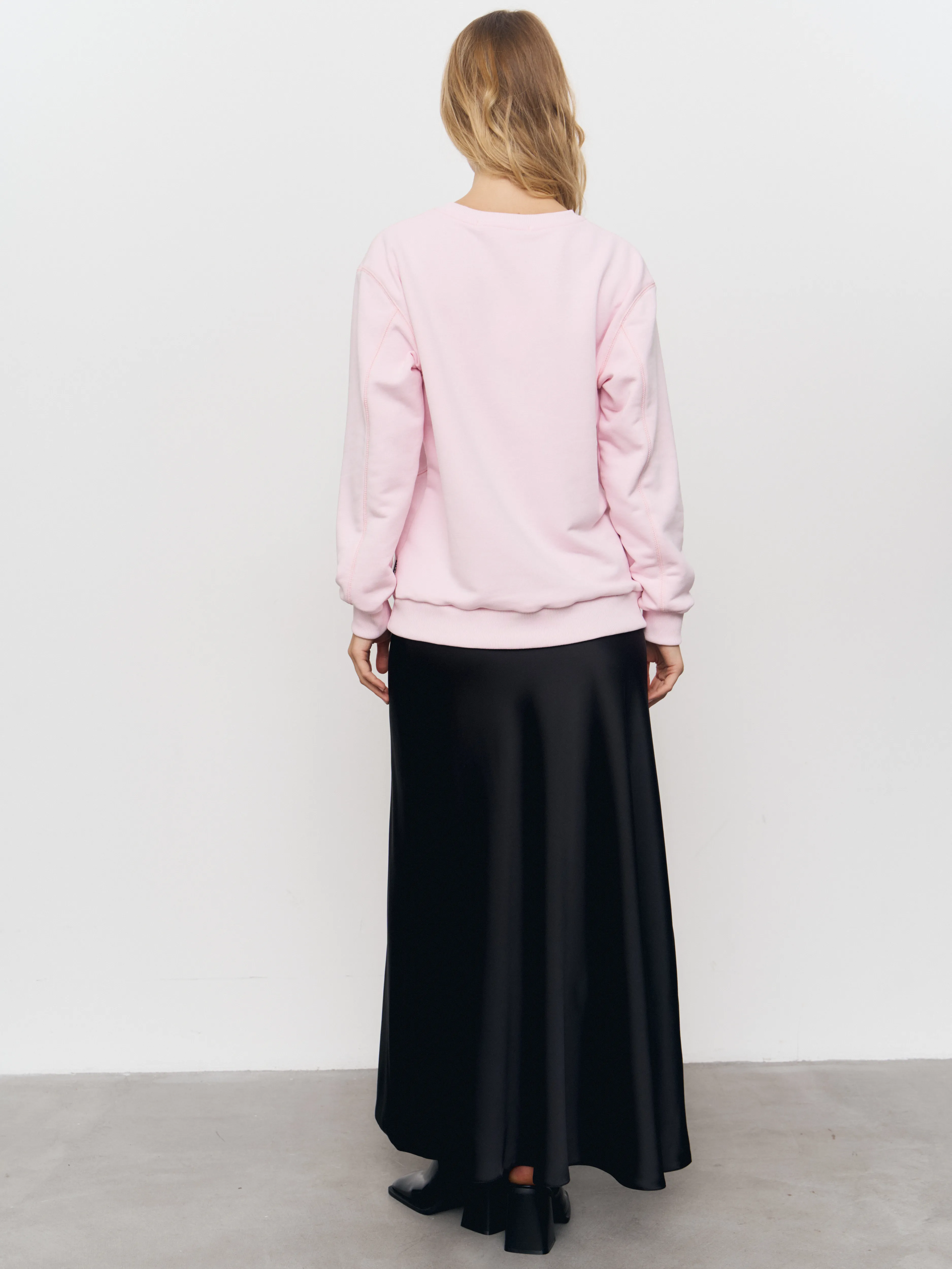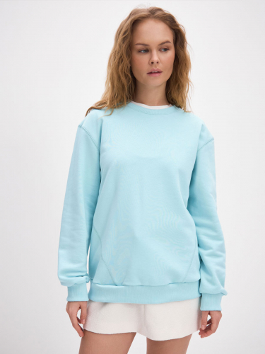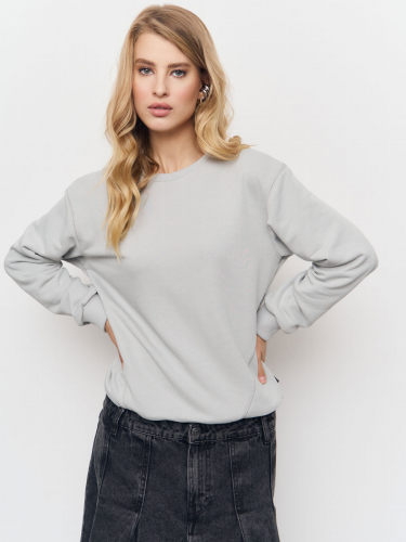 Женская толстовка из футера 3-х нитка петля, с втачным рукавом, с круглым вырезом по горловине, обработанным бейкой из кашкорсе. Толстовка без карманов, с отрезными бочками по переду. В толстовке манжеты и пояс из кашкорсе в цвет футера.