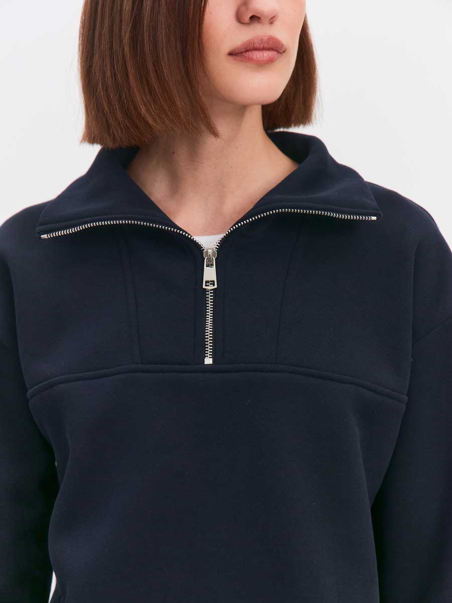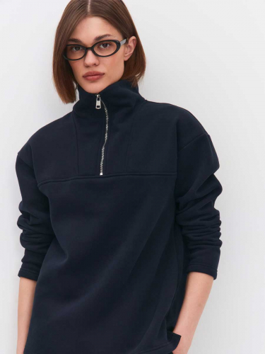 Женская толстовка из футера 3-х нитка микро-начес с "эффектом велюра". Толстовка с втачным рукавом и втачным модельным воротником. Центральная застежка на короткую металлическую молнию. Низ толстовки, низ рукавов обработаны на плоскошовной м-не. По боковым швам – разрезы.