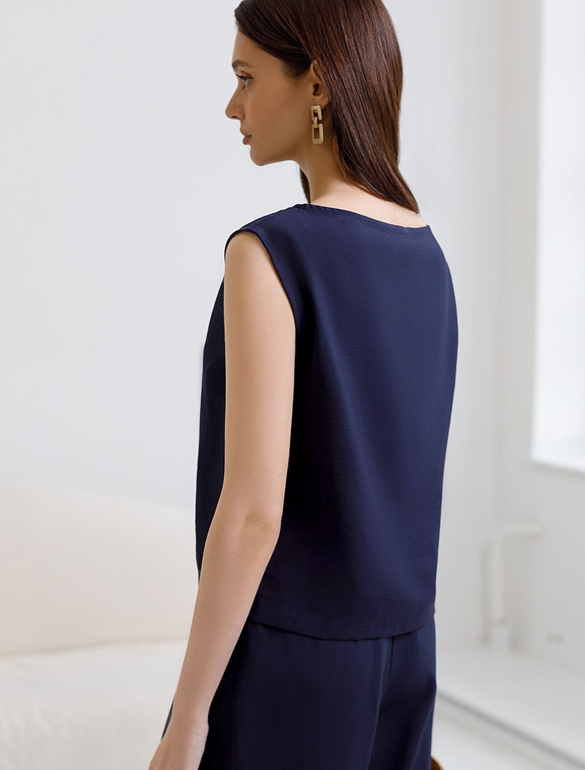 Изысканный топ темно-синего цвета с элегантным вырезом-лодочкой. Лиоцелл это более дорогой и экологичный вариант вискозы, очень прочный и шелковистый. Ткань отличается от регулярной коллекции из лиоцелла - она содержит еще больше лиоцелла (92%), благодаря чему имеет более нежную шелковистую фактуру. Вырез лодочка придает топу утонченность, а небольшие разрезы по бокам добавляют легкости. Простой прямой крой в сочетании с интересными деталями создает стильную и в то же время комфортную вещь. Топ средней длины подойдет для любительниц базовой одежды, которые хотят деликатно повысить градус своего стиля. Этот лаконичный топ будет идеальным выбором для теплого времени года или многослойных ансамблей.