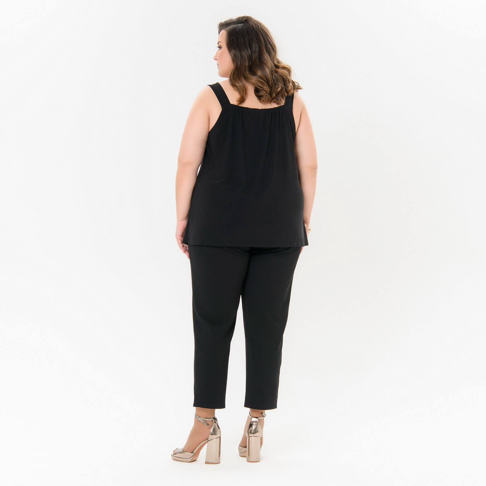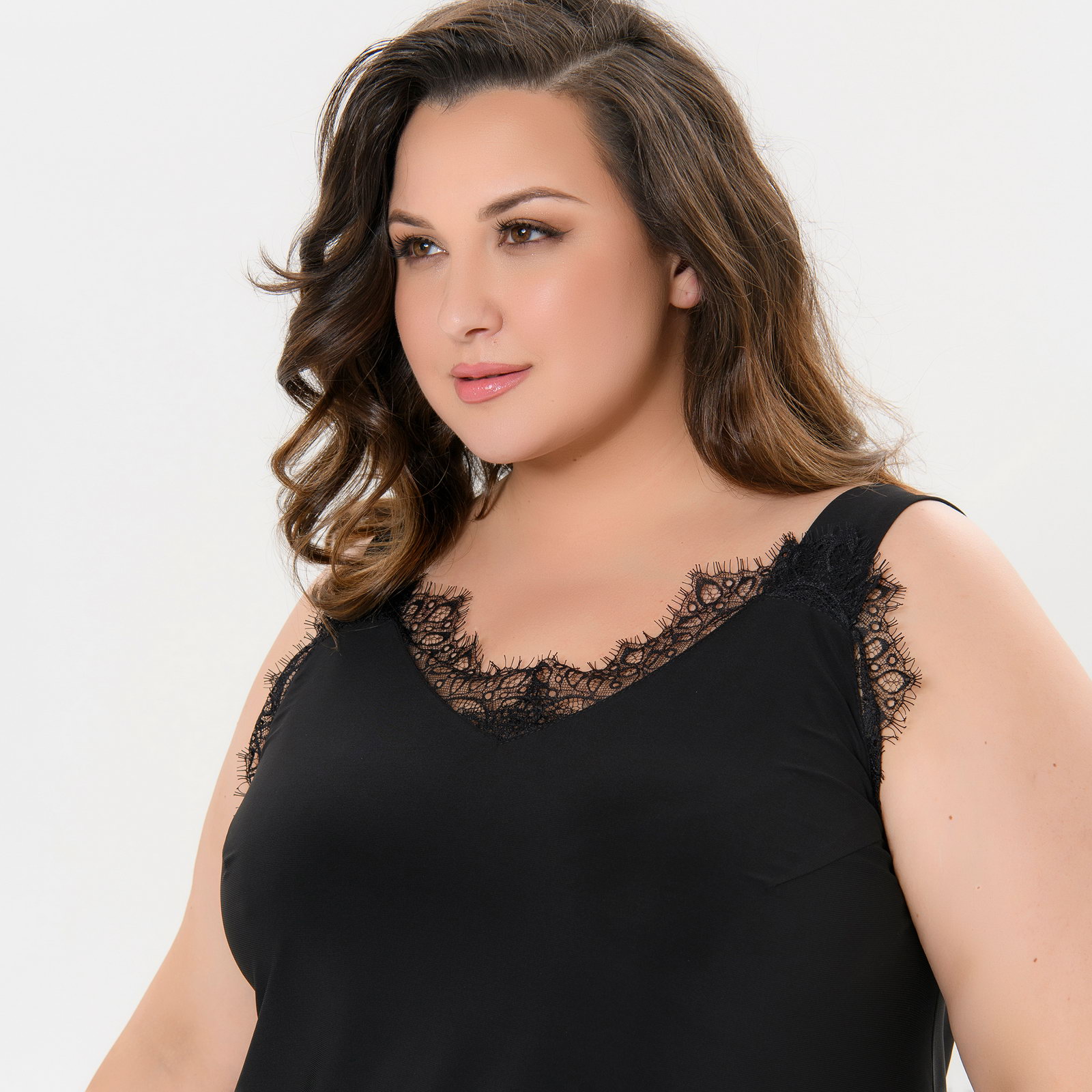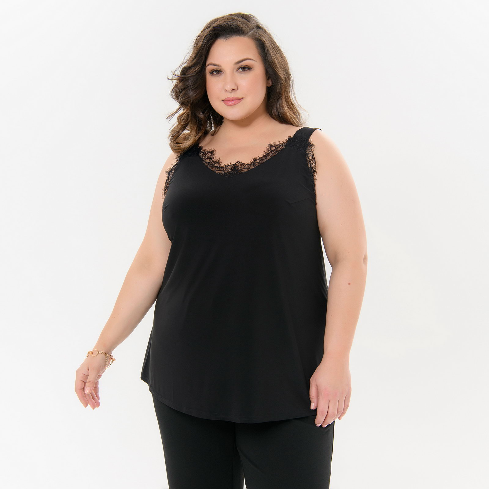 Топ из струящегося трикотажа "масло" на бретелях. Фигурный вырез полочки украшает нежное черное кружево "реснички".