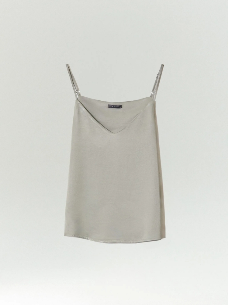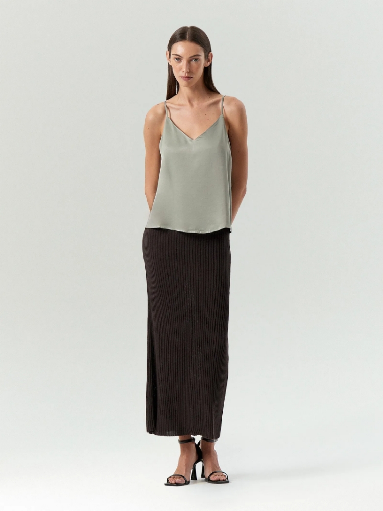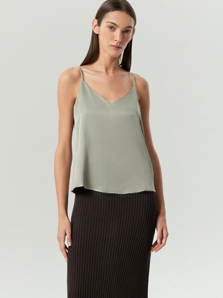 Топ в актуальном оттенке между фисташкой и шалфеем для стильных образов. Выполнен из тактильно приятной вискозы. Модель на регулируемых тонких бретелях имеет широкий V-образный вырез. Подойдёт к любому базовому низу