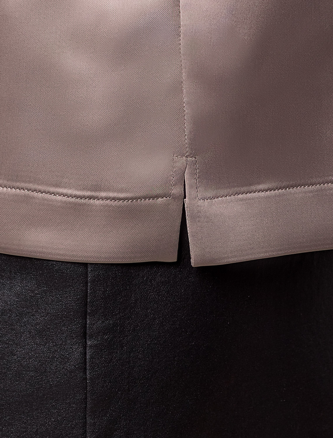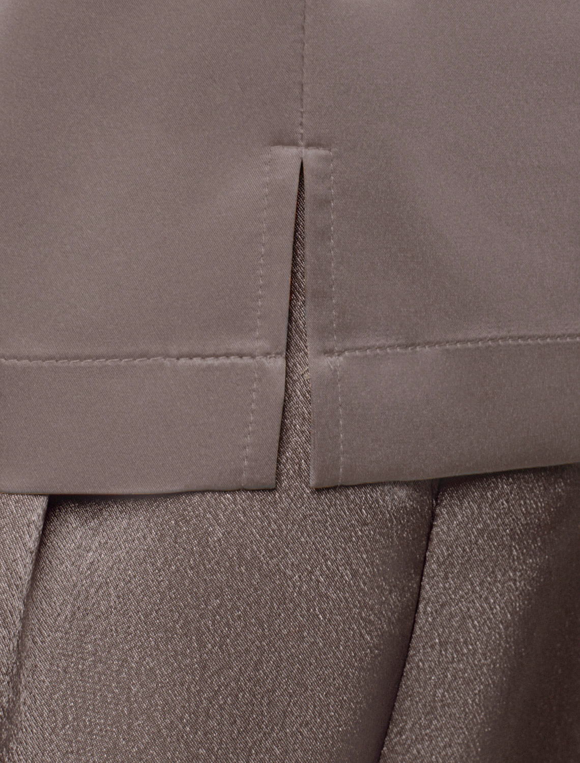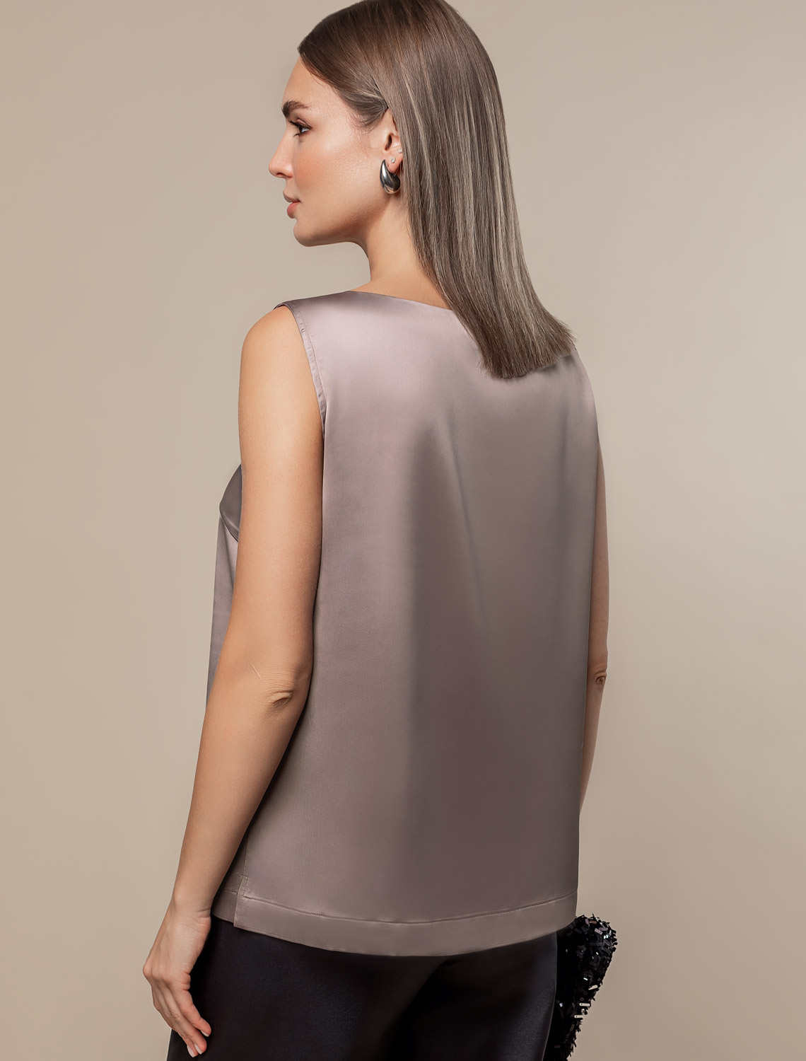 Топ выполнен из струящегося сатина напоминающий натуральный шелк. Модель с горловиной формы лодочка дополнена вытачками и двумя разрезами по бокам. Сочетайте изделие в костюме с юбкой D26.193 и брюками D24.221 чтобы создать роскошный праздничный образ. В комплекте с джинсами или любым другим низом из гардероба, для повседневного образа. кофейный