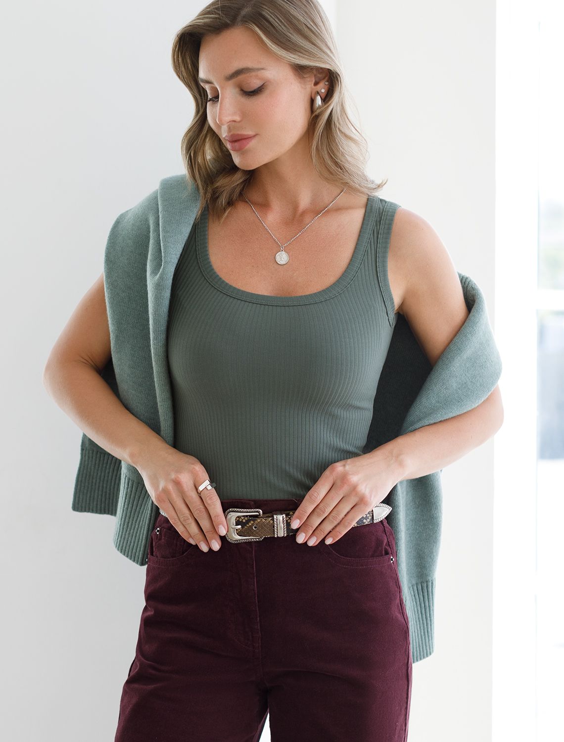 Топ выполнен из трикотажа в широкий рубчик. Эластичный хлопковый трикотаж сидит по фигуре, не сковывает движений и очень комфортный в носке. Фактура вертикальных полос визуально стройнит и вытягивает силуэт. Базовое изделие хорошо впишется в любой гардероб. Идеально подходит для многослойных образов.