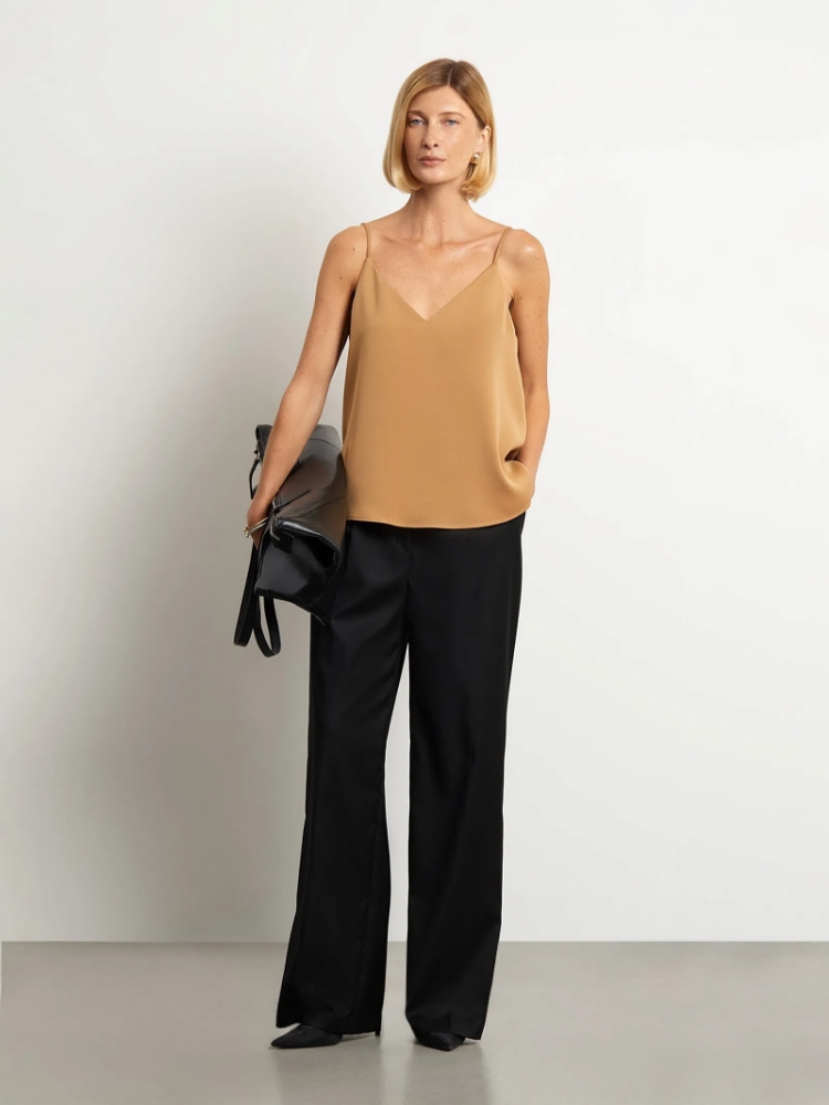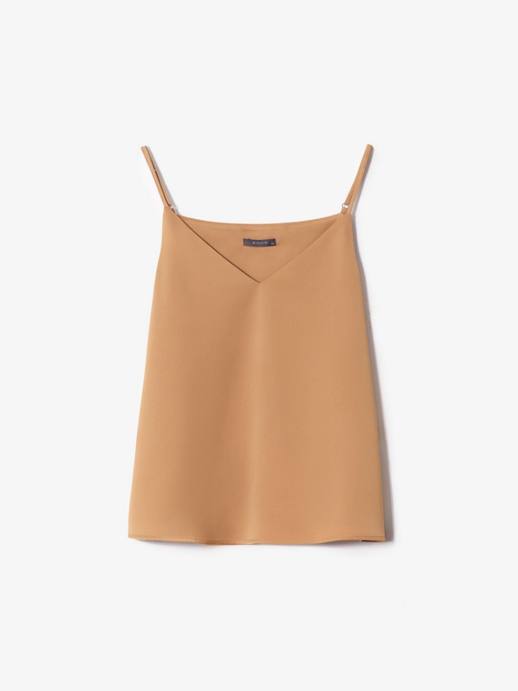 Базовый топ в бежево-золотистом цвете. Его можно носить под жакеты и болеро, соло с любым низом. Модель имеет широкий V-образный вырез спереди и неглубокий вырез каре сзади. Выполнена на регулируемых тонких бретелях: удобно подогнать под индивидуальные особенности