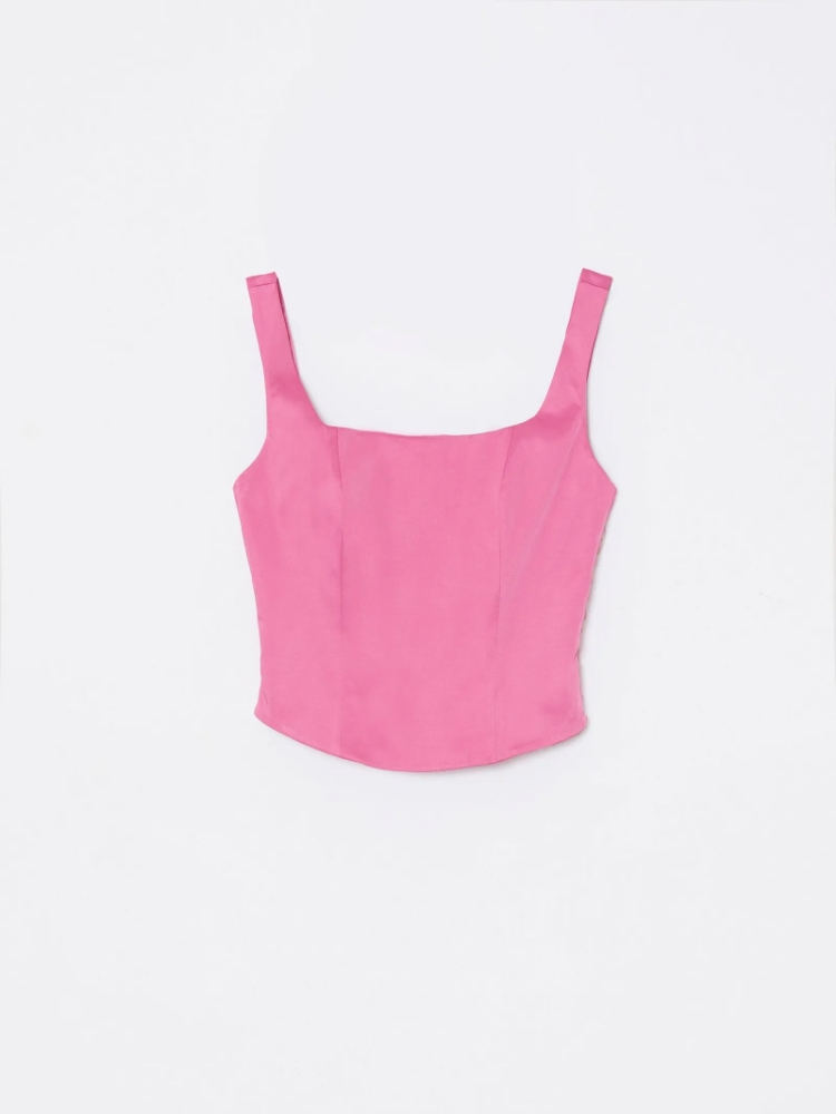 Корсетный топ в приятном глазу розовом цвете. Модель на широких бретелях с вырезом каре и открытой спиной подчеркнёт достоинства фигуры. Застёгивается на молнию сбоку. Дополнить топ можно роскошными брюками из комплекта. Изделие выполнено из материала с содержанием хлопка, без подкладки