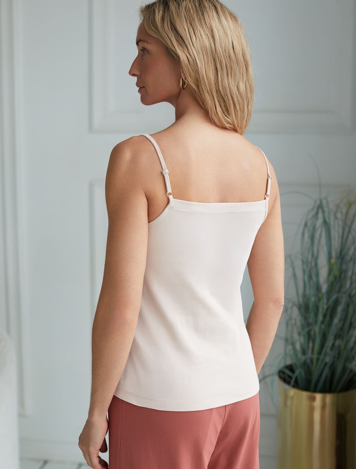 Идеальный базовый топ облегающего кроя приятного светло-бежевого цвета в выполнен из премиального хлопка. Ткань приятна на ощупь, имеет отличную воздухопроницаемость, что обеспечивает комфорт в жаркую погоду, в тоже время не просвечивает, выглядит дорого. Открытое декольте и аккуратные тонкие регулируемые бретели деликатно подчеркнут изящную шею и плечи.