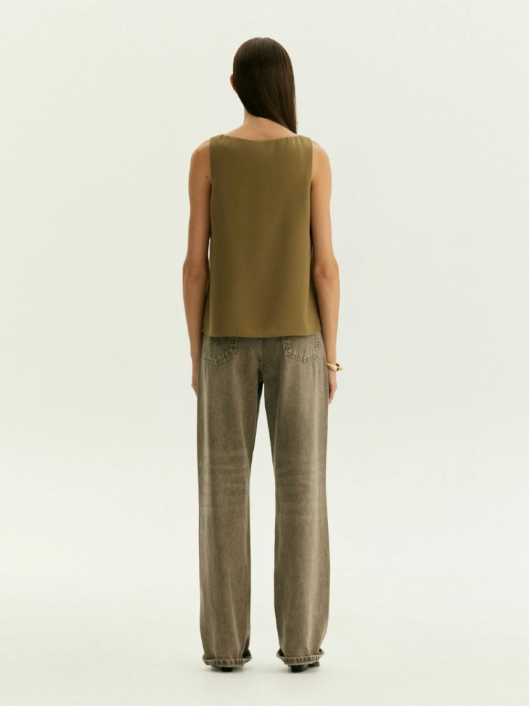 Стильный топ в мягком оливковом оттенке разбавит повседневные образы модным цветовым акцентом. Этот оттенок решает сразу три задачи в образе: делает его дорогим и благородным, держит вровень с трендами сезона, встраивает в деловой дресс-код с сохранением индивидуального стиля. Топ удобен для того, чтобы носить его под жакеты. Имеет проймы комфортной глубины. Прямая модель на широких бретелях дополнена универсальным V-вырезом. Топ сделан без подкладки