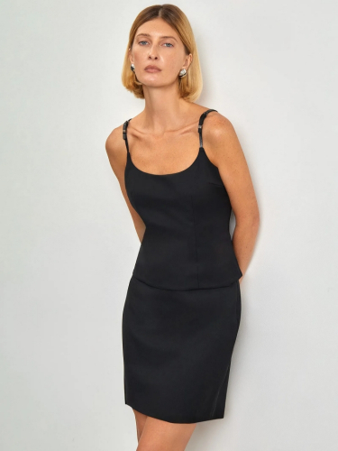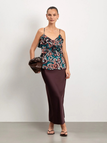 Топ с крупными абстрактными цветами сочетает в себе бирюзовый, розовый и коричневый цвета. Отделан нарядными воланами в области груди и талии. Приталенная модель на тонких бретелях отлично подойдёт для коктейльных образов и не только. Сочетается с любым базовым низом и юбкой из комплекта dora