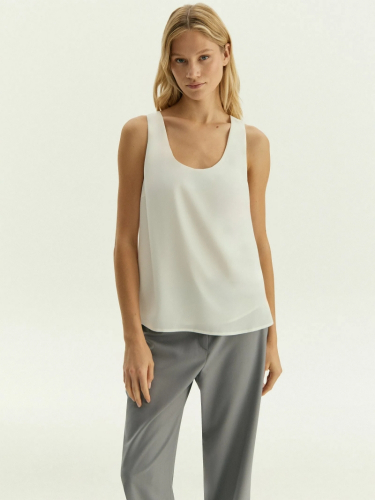 Чёрный топ с U-вырезом смотрится актуально и стильно. Модель без застёжек в меру свободна, не стесняет движений, удобна под жакеты и без них. Топ сделан на подкладке