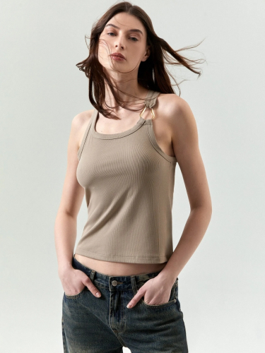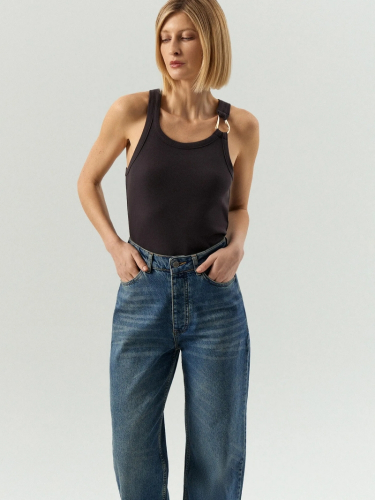 Трикотажный топ в тёмно-сером цвете для модных кэжуальных образов. Имеет металлическую вставку в одной из бретелей, отделан планкой по вороту и проймам. Модель по фигуре делают ещё удобнее глубокие проймы и широкие бретели. Топ можно сочетать с любым денимом. Изделие выполнено из эластичного материала с содержанием вискозы