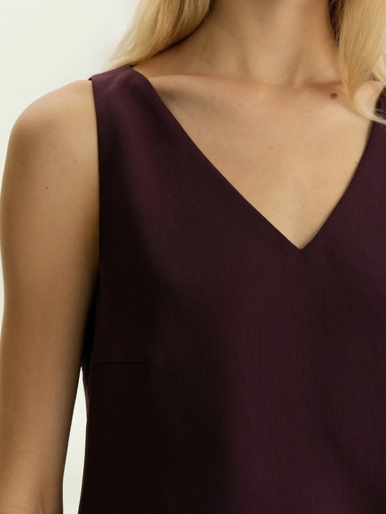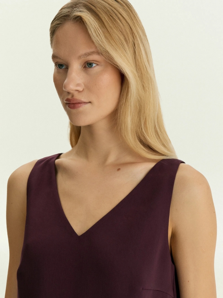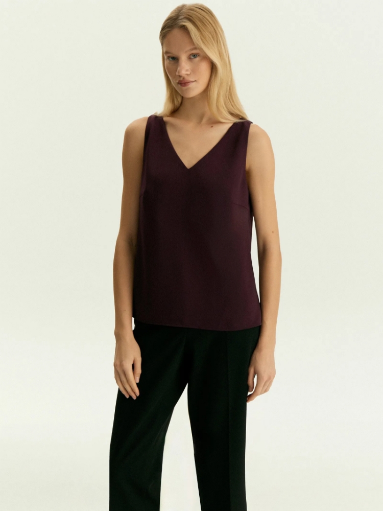 Стильный топ в цвете инжира разбавит повседневные образы модным цветовым акцентом. Этот оттенок решает сразу три задачи в образе: делает его дорогим и благородным, держит вровень с трендами сезона, встраивает в деловой дресс-код с сохранением индивидуального стиля. Топ удобен для того, чтобы носить его под жакеты. Имеет проймы комфортной глубины. Прямая модель на широких бретелях дополнена универсальным V-вырезом. Топ сделан без подкладки