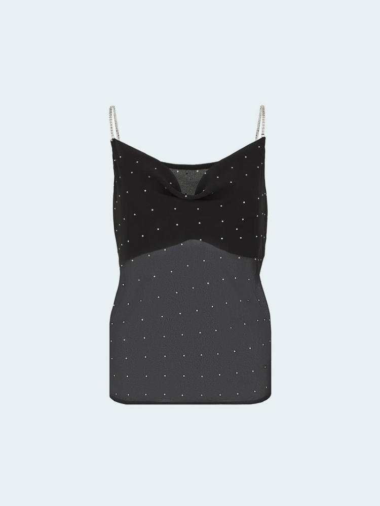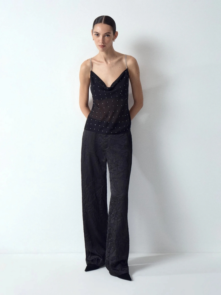 Полупрозрачный топ из лёгкого и мягкого шифона в чёрном цвете украшен рядами некрупных страз с деликатным звёздным сиянием. Они не перегружают образ, но делают его интереснее. Тонкие акцентные бретели также украшены стразами, немного более крупными. Топ легко и красиво садится, элегантно смотрится за счёт лаконичного фасона без лишних деталей. Модель маломерит на один размер. Выполнена без подкладки