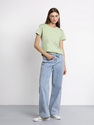 Базовая трикотажная футболка светло-зелёного оттенка. Модель прямого силуэта выполнена из плотного непросвечивающего хлопка. Универсальная длина позволяет носить изделие как навыпуск, так и в заправленном виде. Однотонная футболка будет незаменимой базовой вещью в любом гардеробе