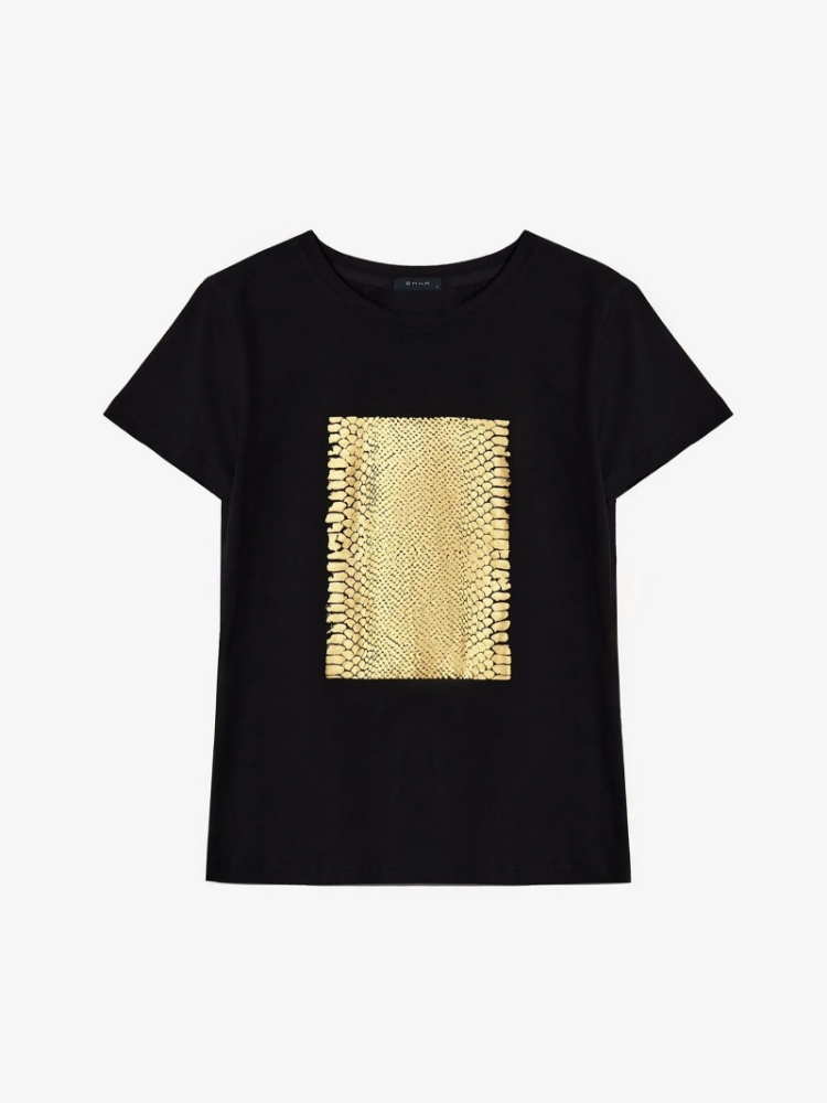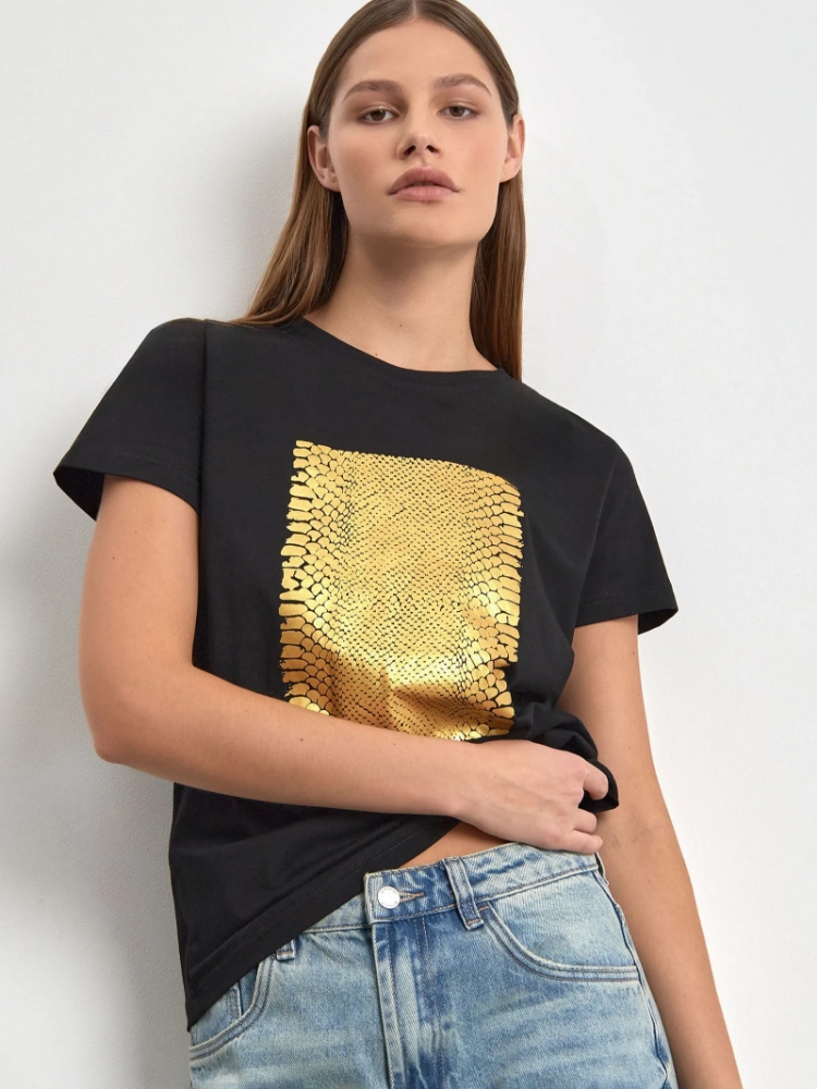 Хлопковая футболка с крупным золотым принтом добавит в гардероб немного сияния. За счёт чёрного фона футболка будет сочетаться с любым низом. Такая вещь может быть основой как повседневного, так и праздничного образа — например, к Новому году