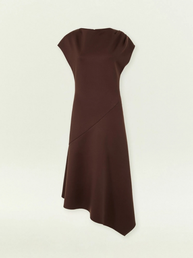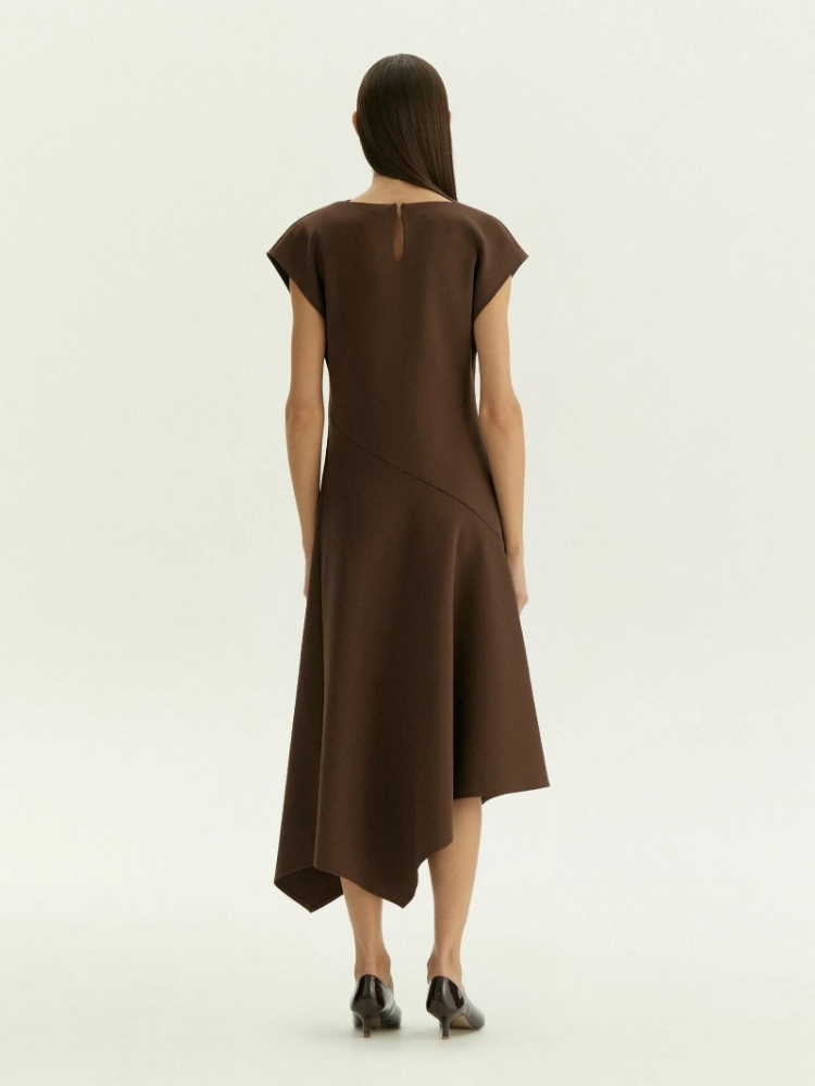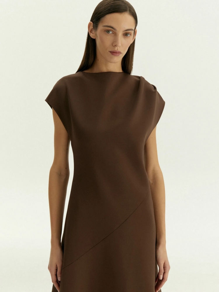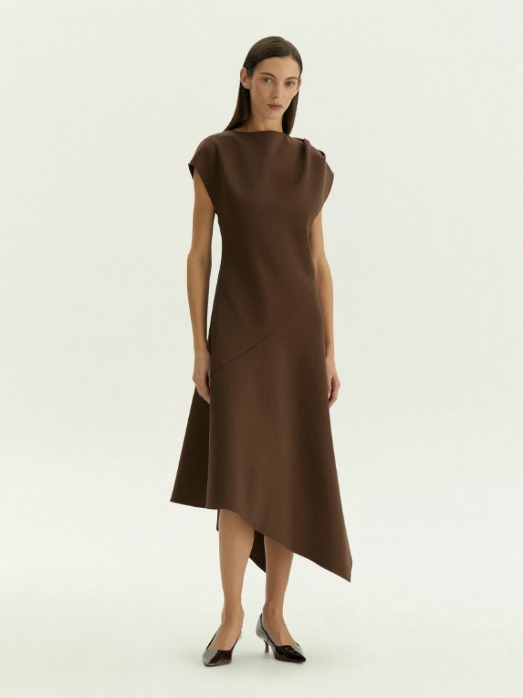 Элегантное платье в шоколадном цвете подойдёт на выход или на каждый день. За счёт материала оно будет актуально в любой сезон. Плотный трикотаж наполовину состоит из хлопка и комфортен к телу. Модель с коротким рукавом отличают асимметричный крой и драпировка в портретной зоне. Сзади имеется небольшой вырез-капля под крючками. Сделано без подкладки