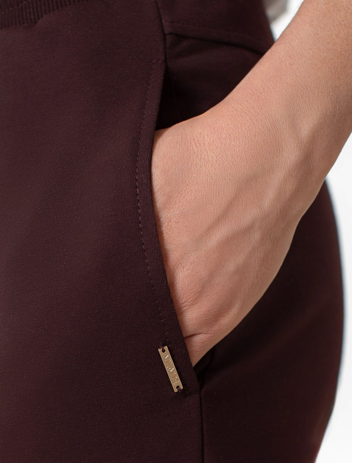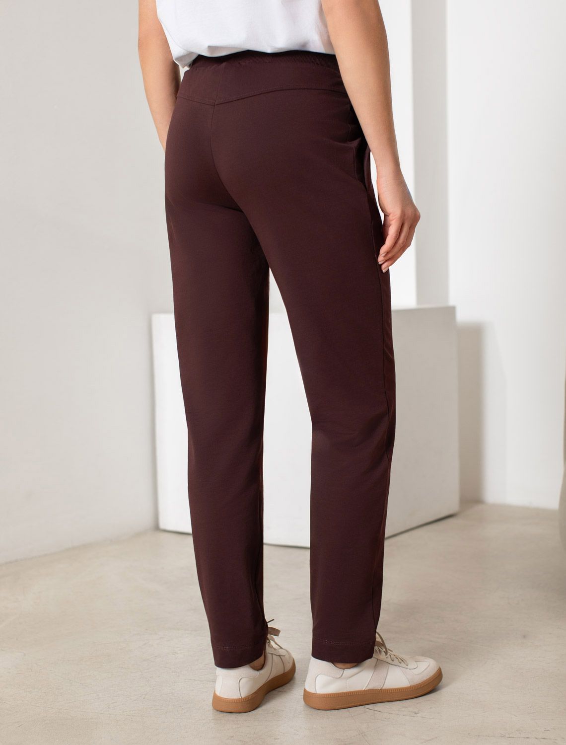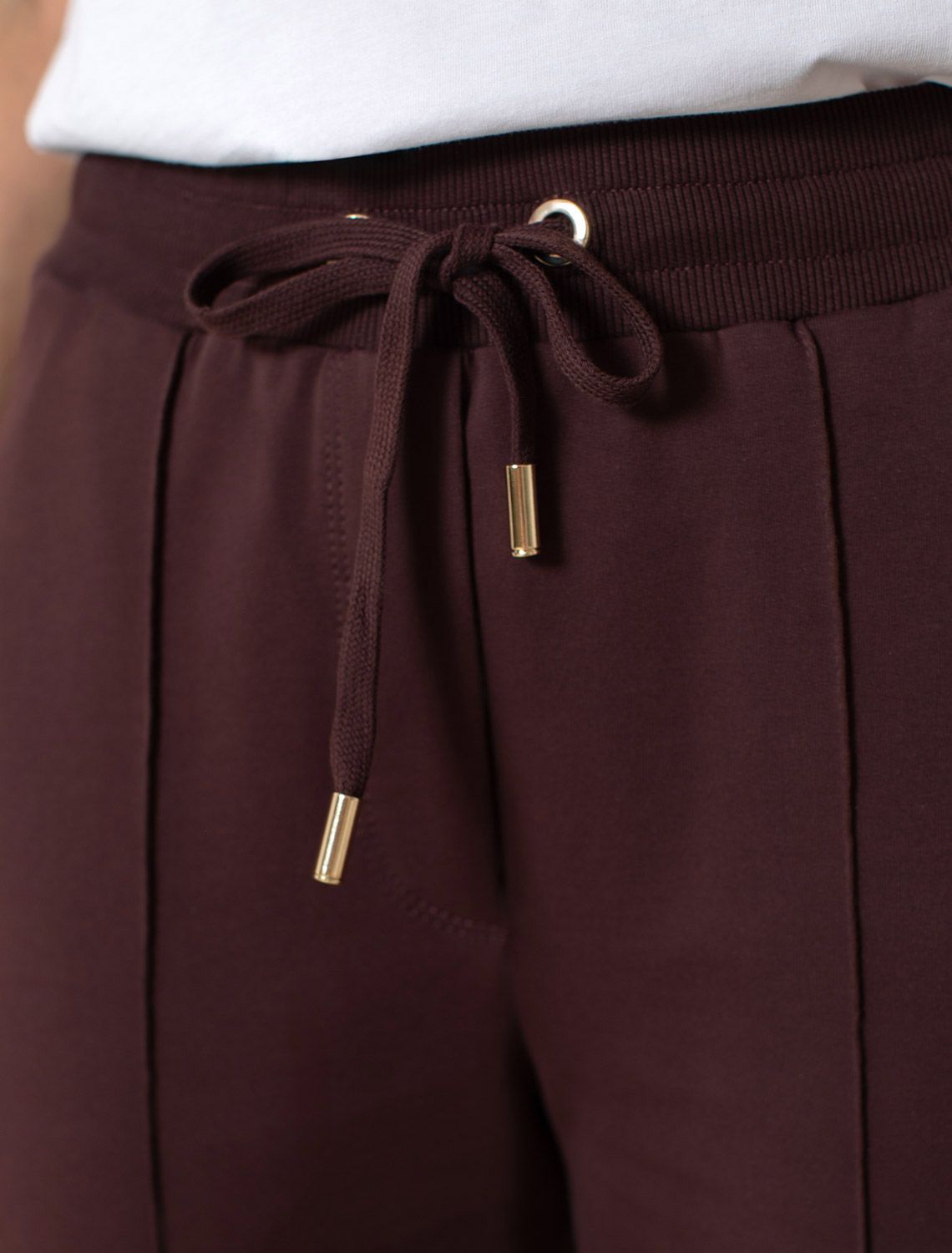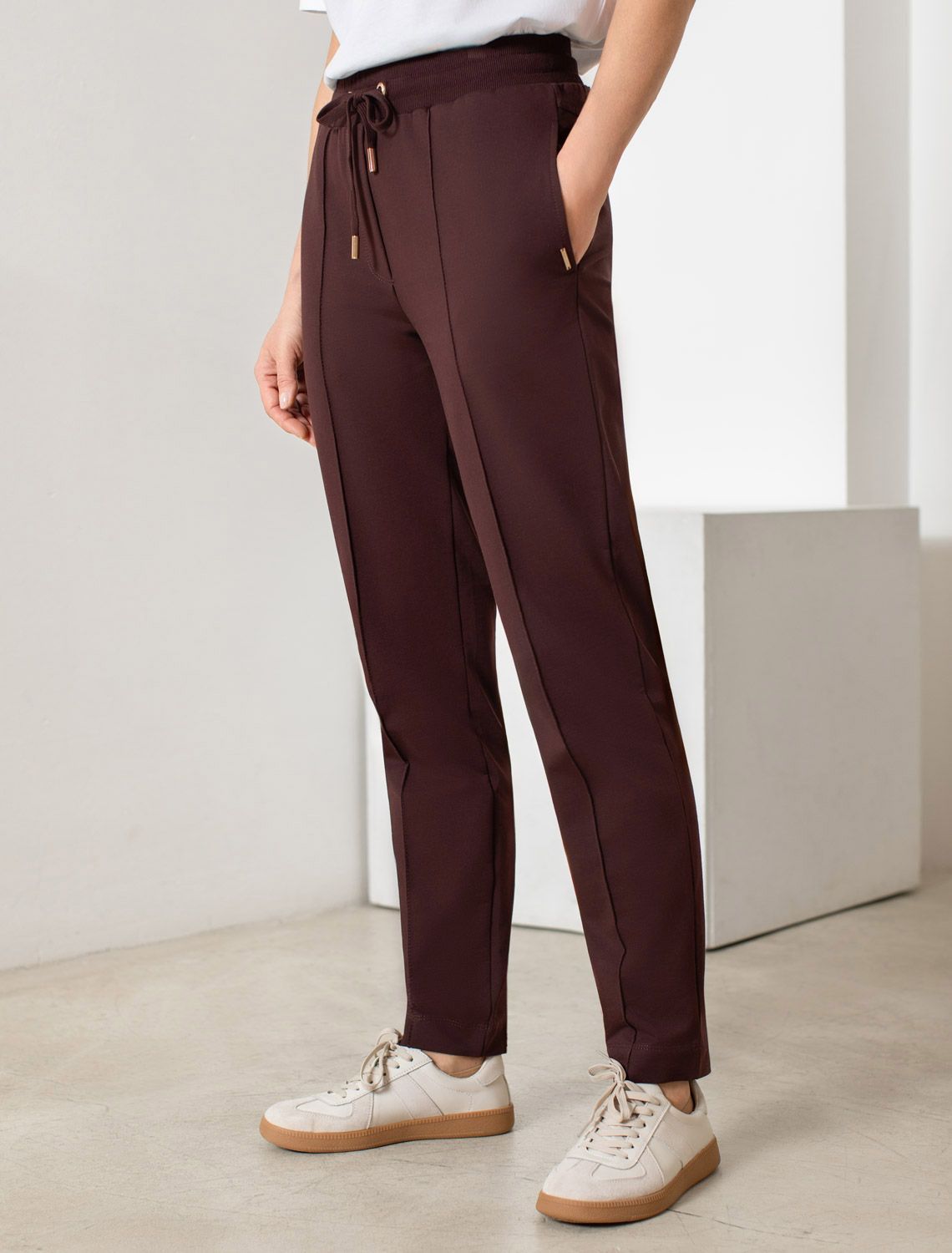 Брюки коричневого цвета зауженного кроя выполнены из премиального футера-двухнитки. Лаконичный силуэт поддерживают застроченные стрелки, зрительно вытягивающие силуэт. Удобный пояс на резинке регулируется хлопковым шнурком с золотистой фурнитурой. Наличие эластана в составе изделия гарантирует комфорт и долговечность изделия. Эластичный материал хорошо пропускает воздух, позволяя телу дышать, и легко тянется, не ограничивая движения.