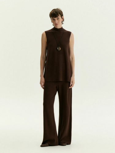 Трикотажный топ в шоколадном цвете — идеальный вариант на каждый день, который удобно носить соло и под жакеты. Незаменим в демисезонных и зимних капсулах. Удлинённая модель с высоким воротом, особенно в комплекте с брюками высокой посадки, защищает от холода все важные точки. Топ красиво садится по фигуре за счёт оптимального баланса между свободой и лёгким уклоном в приталенность; добавляет изящества повседневным аутфитам благодаря элегантному фасону. Мягкий трикотаж плотной вязки сделан из вискозы с эластаном. Топ сочетается с брюками из комплекта и любым другим базовым низом в гардеробе. Комплект с брюками станет любимым повседневным образом, который сочетает в себе максимальный комфорт и элегантность