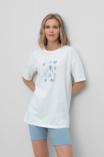 Удлиненная футболка из меланжевого трикотажа. Свободные рукава со спущенной линией плеча создают объём и свободный силуэт. Принт изготовлен из стойких текстильных красителей.