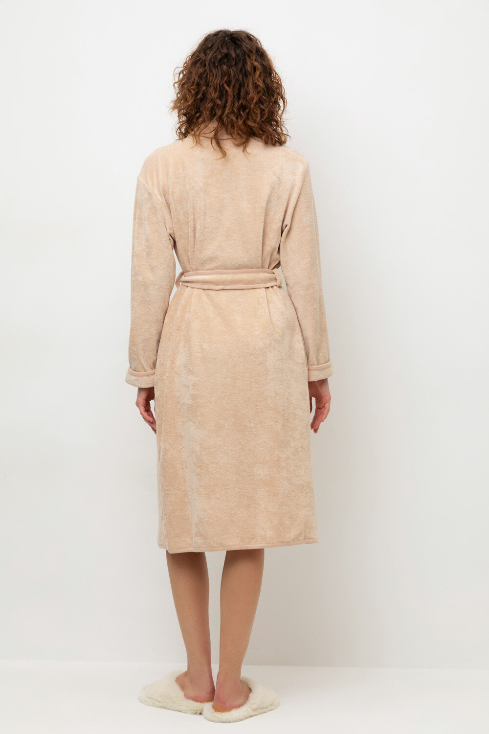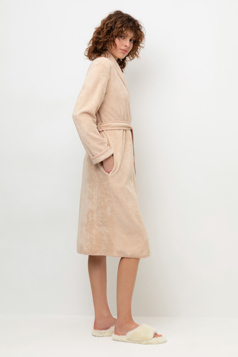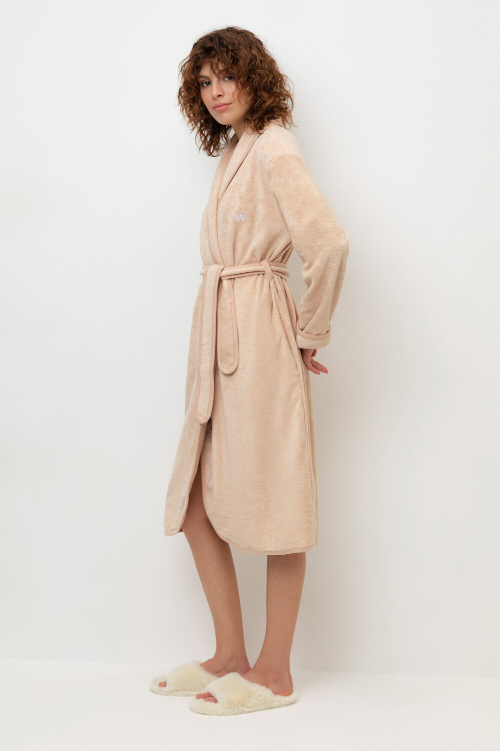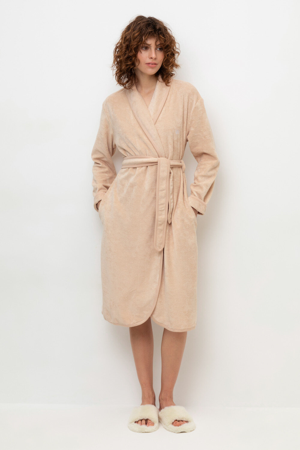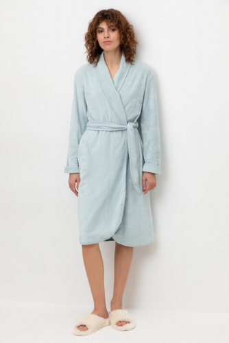 Уютный легкий махровый халат на запах с длинными рукавами. В боковых швах два удобных кармана. На груди вышивка. С помощью пояса можно регулировать посадку и силуэт. Материал приятен к телу и позволяет коже дышать.