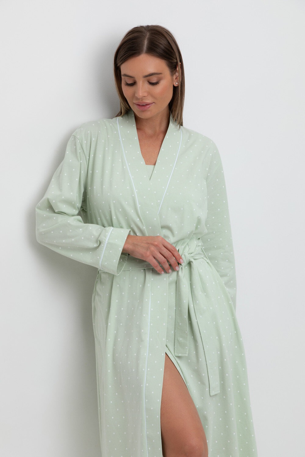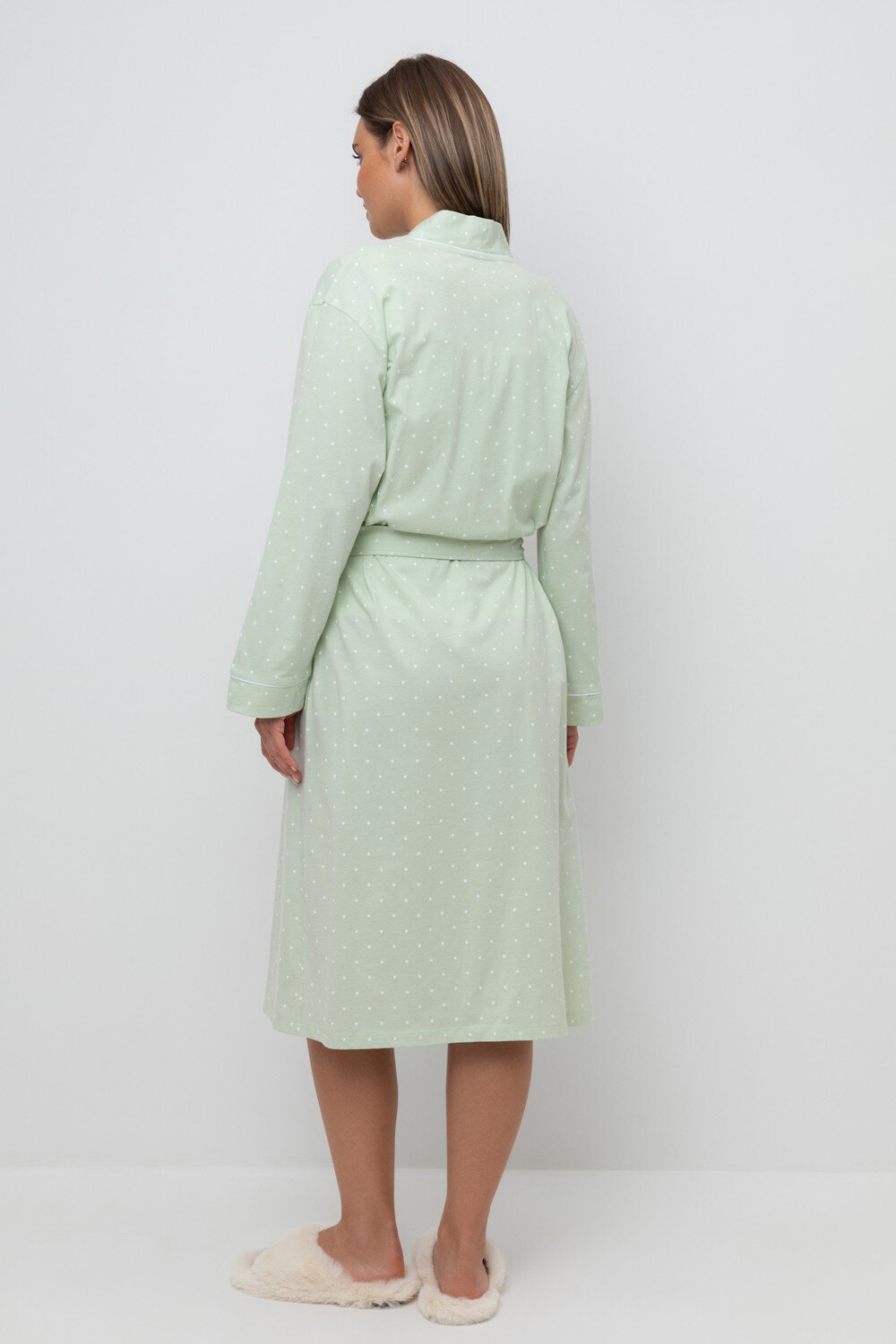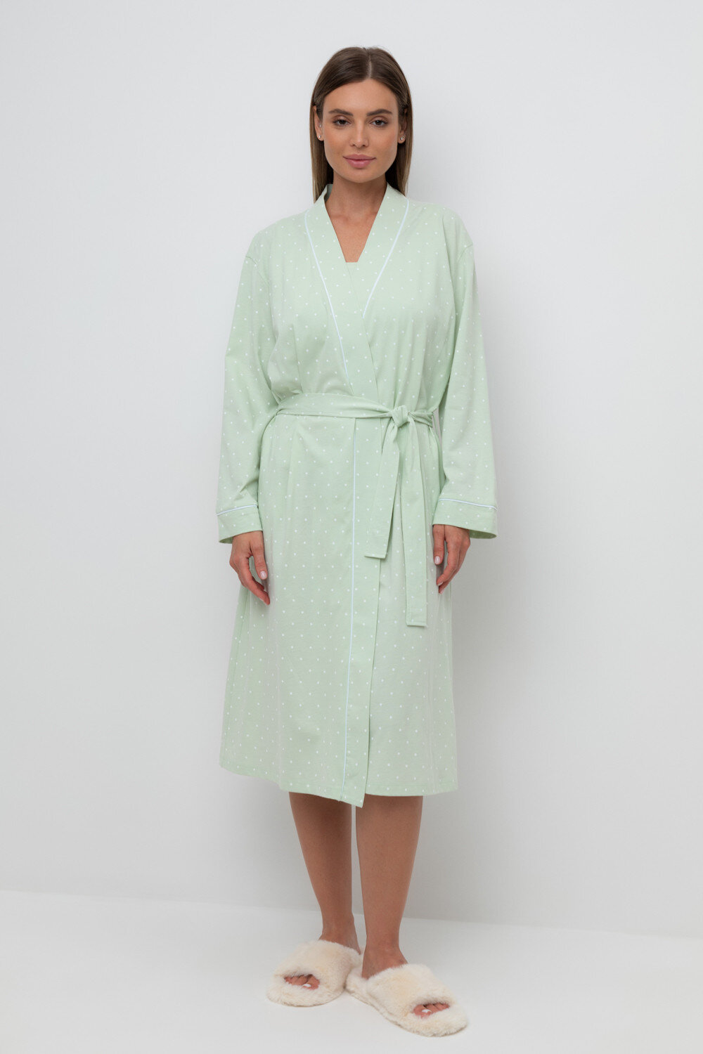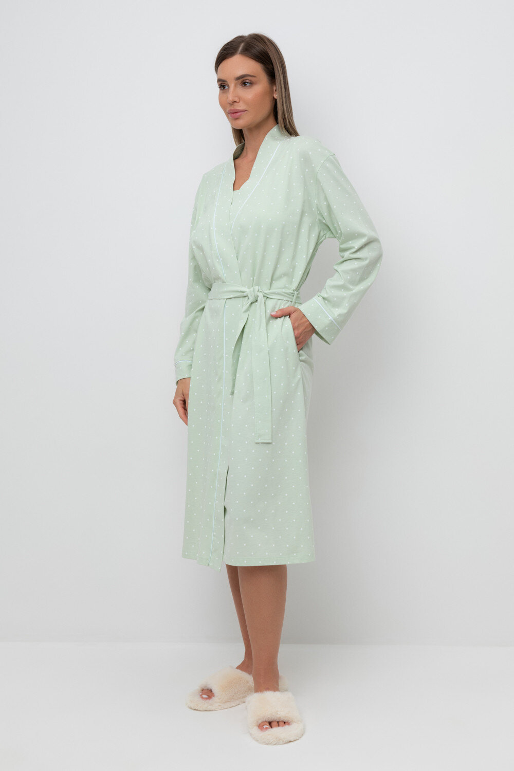 Уютный легкий халат из набивного трикотажа на запах с длинными рукавами. В боковых швах два удобных кармана. С помощью пояса можно регулировать посадку и силуэт. Гладкий материал приятен к телу и позволяет коже дышать.