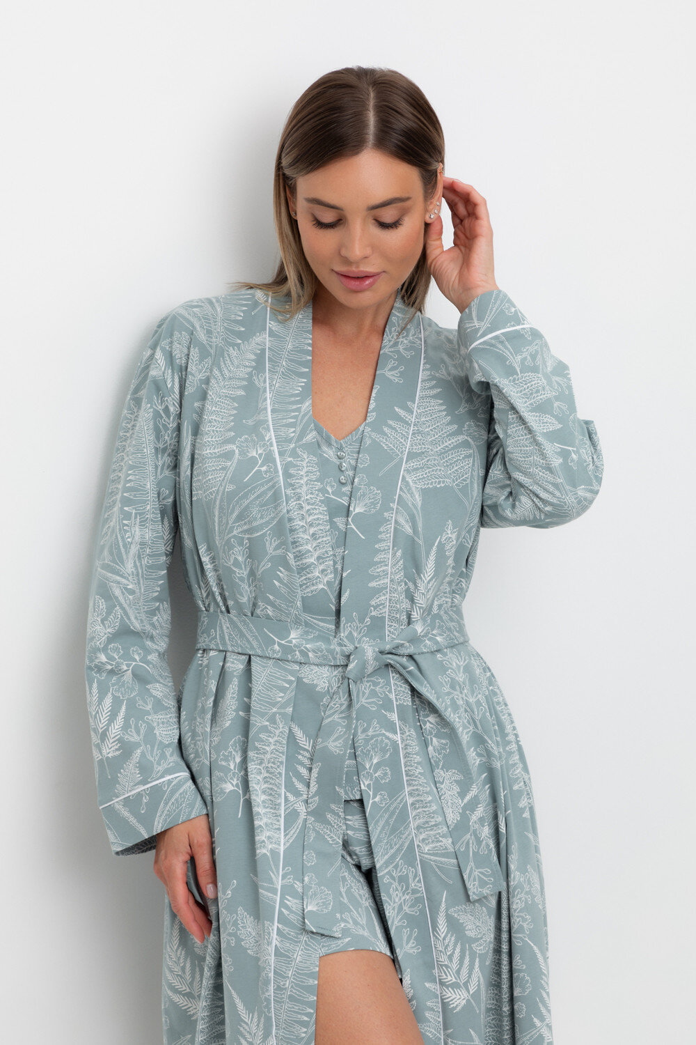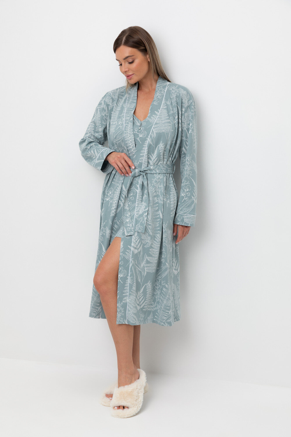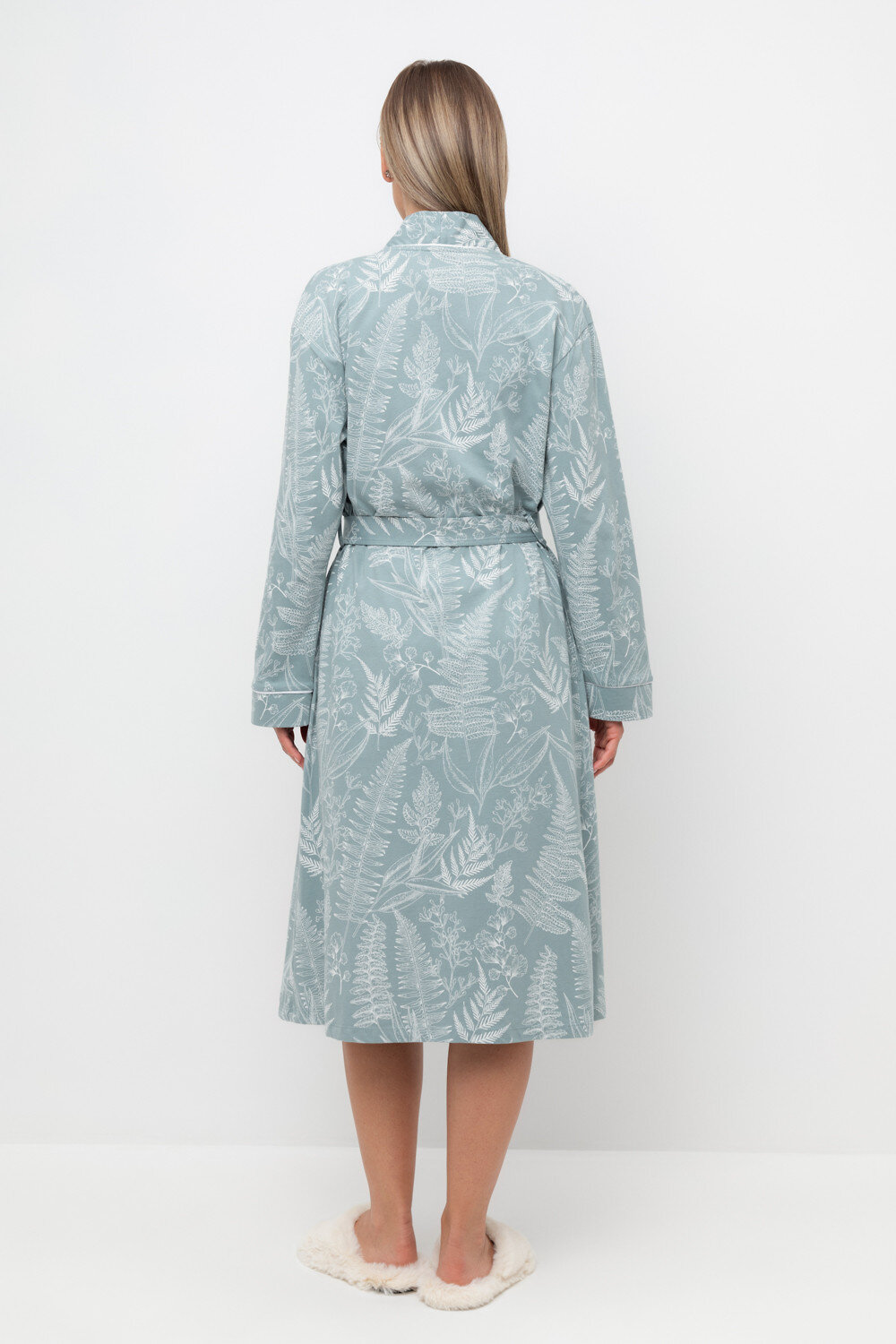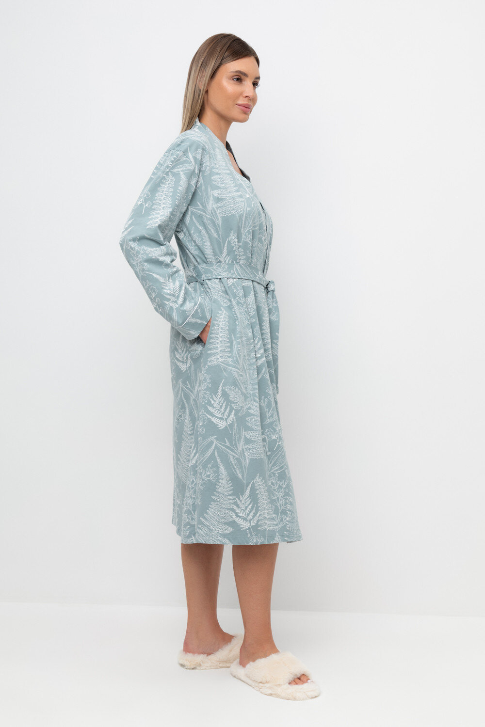 Уютный легкий халат из набивного трикотажа на запах с длинными рукавами. В боковых швах два удобных кармана. С помощью пояса можно регулировать посадку и силуэт. Гладкий материал приятен к телу и позволяет коже дышать.
