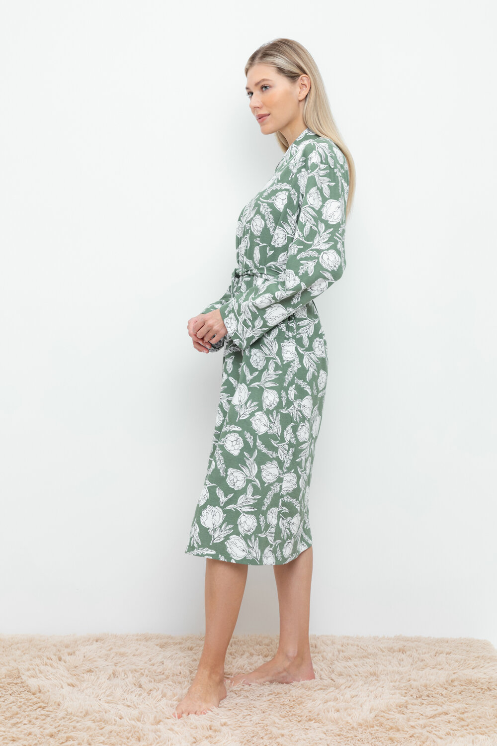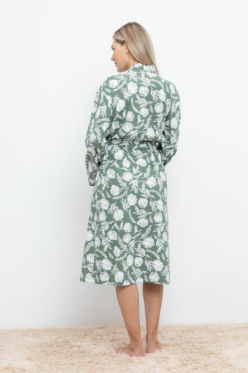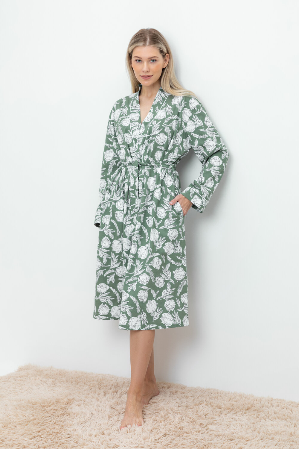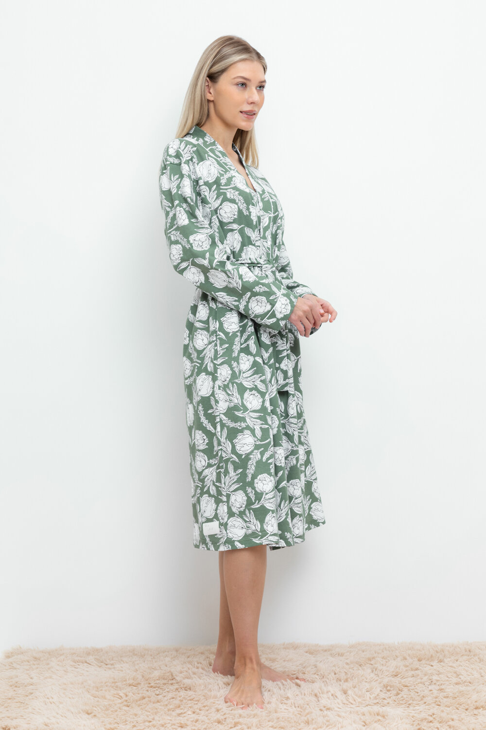 Уютный легкий халат из набивного трикотажа на запах с длинными рукавами. В боковых швах два удобных кармана. С помощью пояса можно регулировать посадку и силуэт. Гладкий материал приятен к телу и позволяет коже дышать.