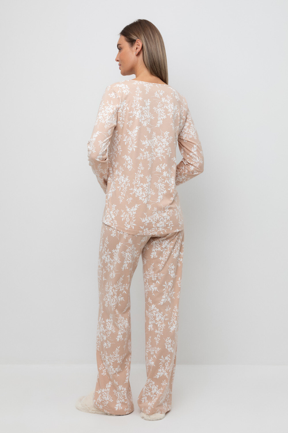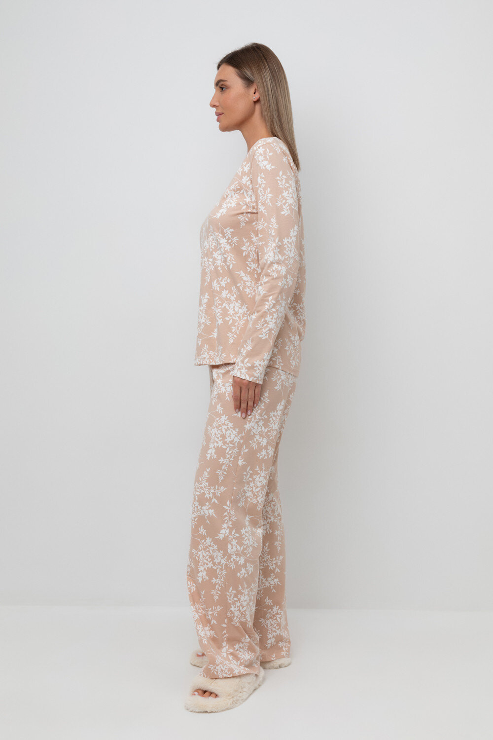 Легкий комплект для комфортного сна и отдыха набивного трикотажа с нежным рисунком из 100% натурального хлопка. Джемпер с V-образным вырезом, украшенный эластичным кружевом комфортно садится по фигуре. Брюки с поясом на резинке и атласной лентой. Гладкий материал приятен к телу и позволяет коже дышать.