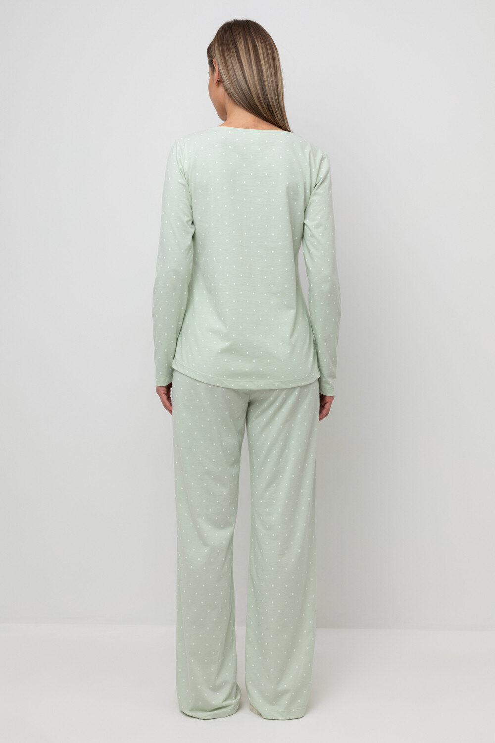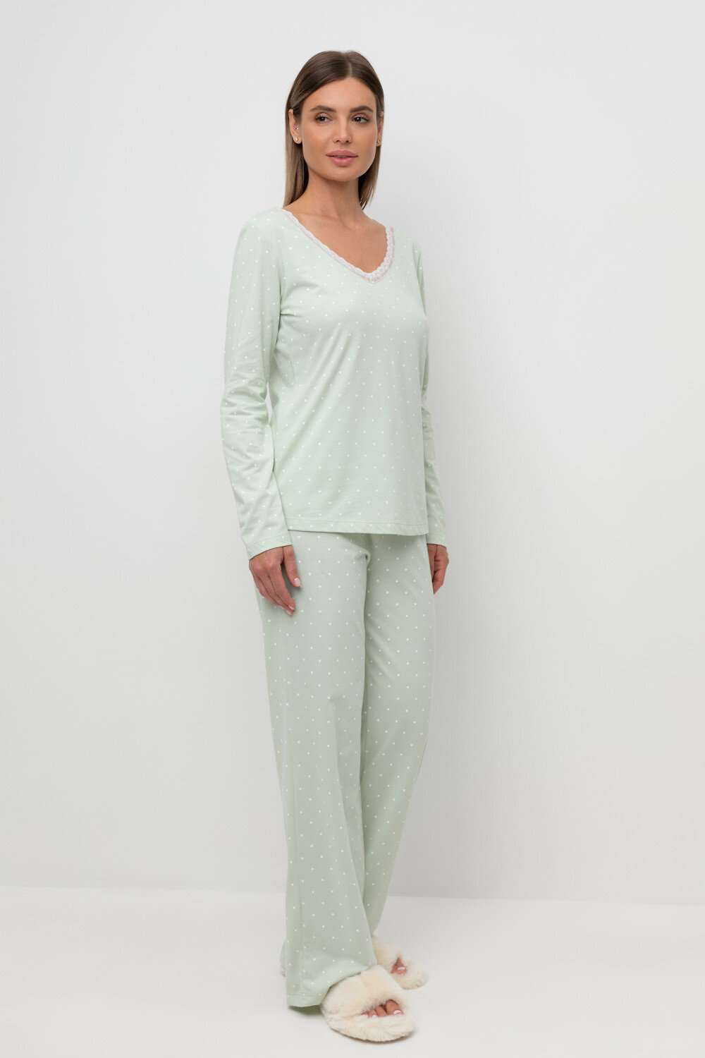 Легкий комплект для комфортного сна и отдыха набивного трикотажа с нежным рисунком из 100% натурального хлопка. Джемпер с V-образным вырезом, украшенный эластичным кружевом комфортно садится по фигуре. Брюки с поясом на резинке и атласной лентой. Гладкий материал приятен к телу и позволяет коже дышать.