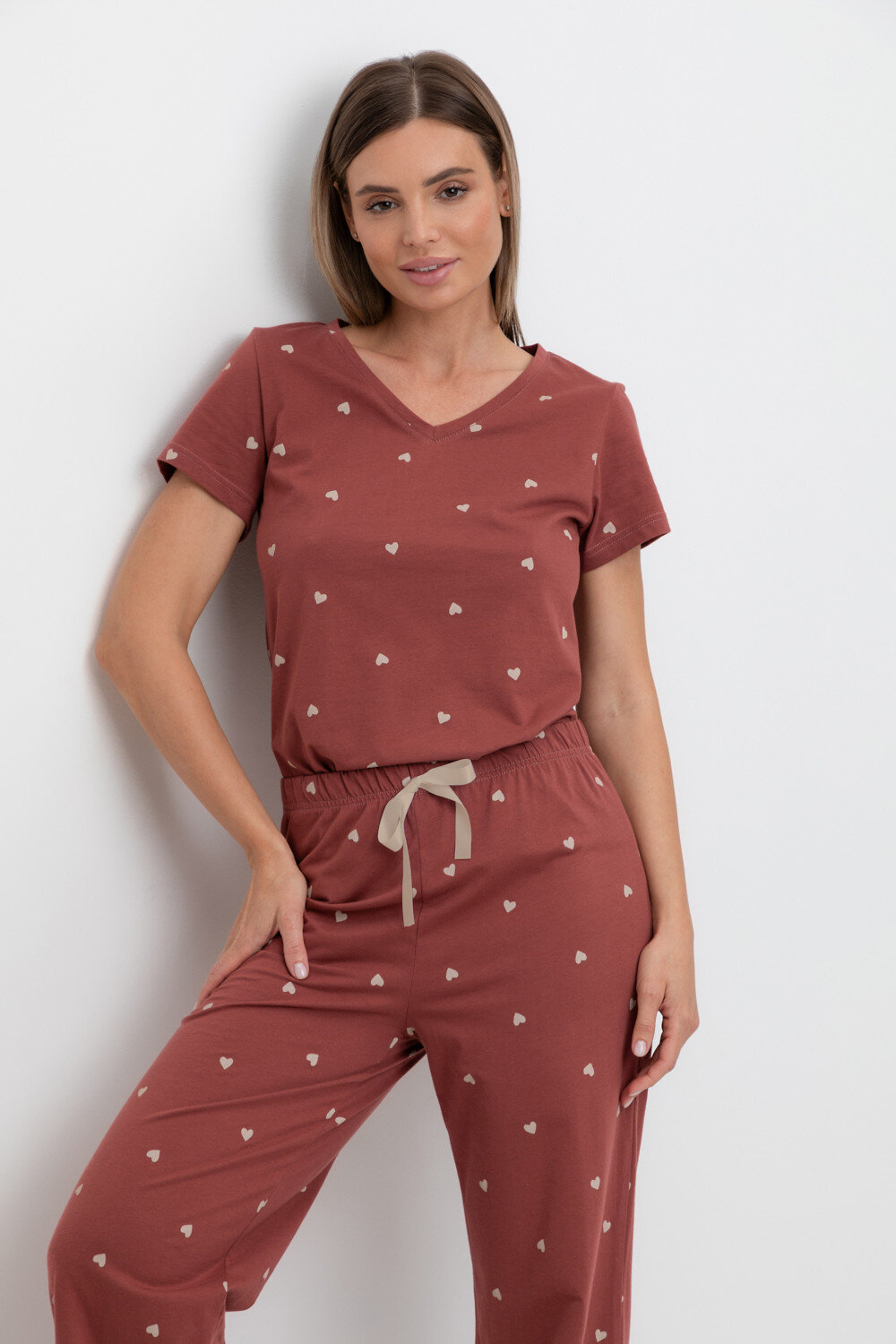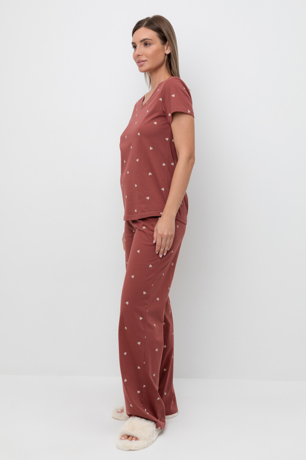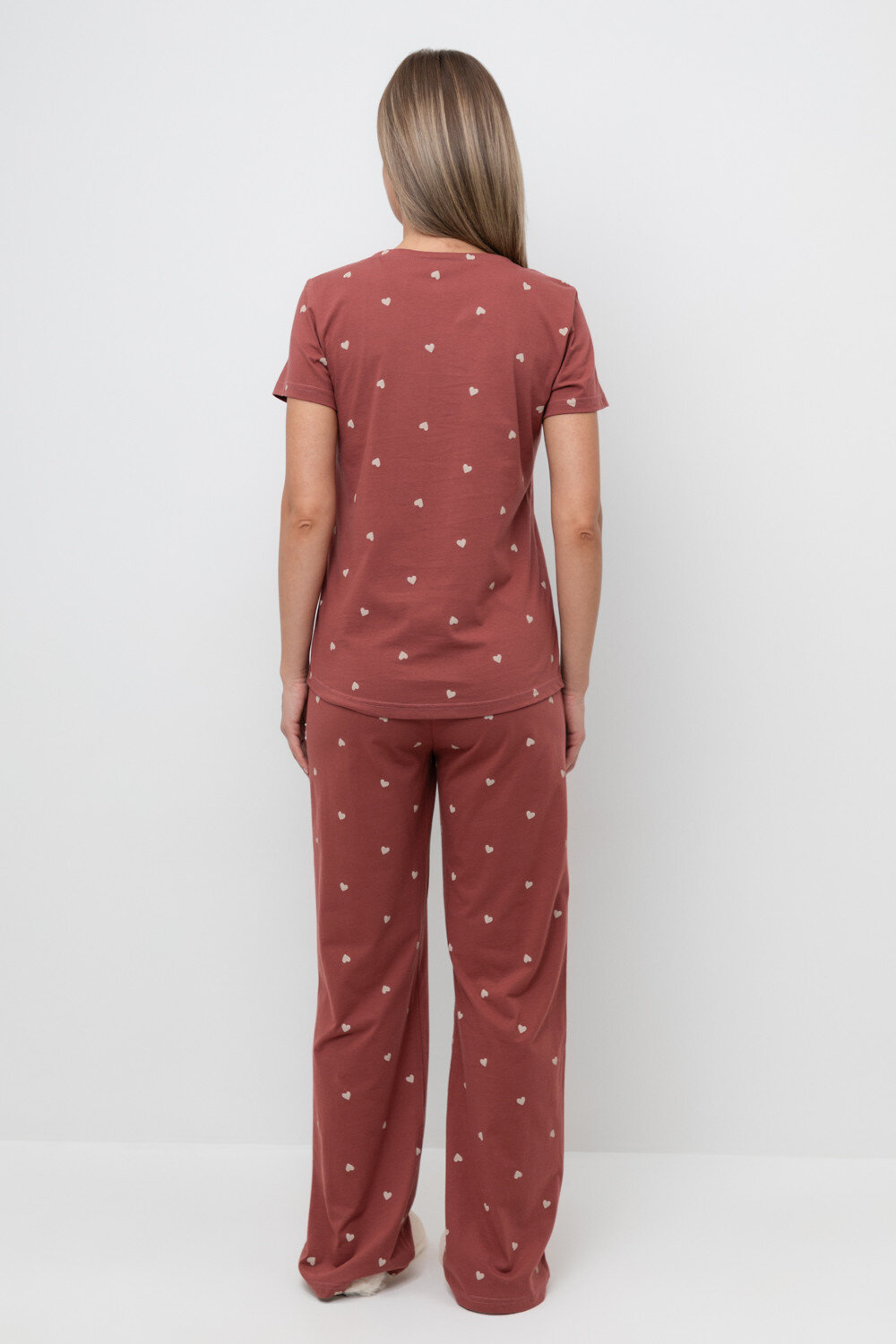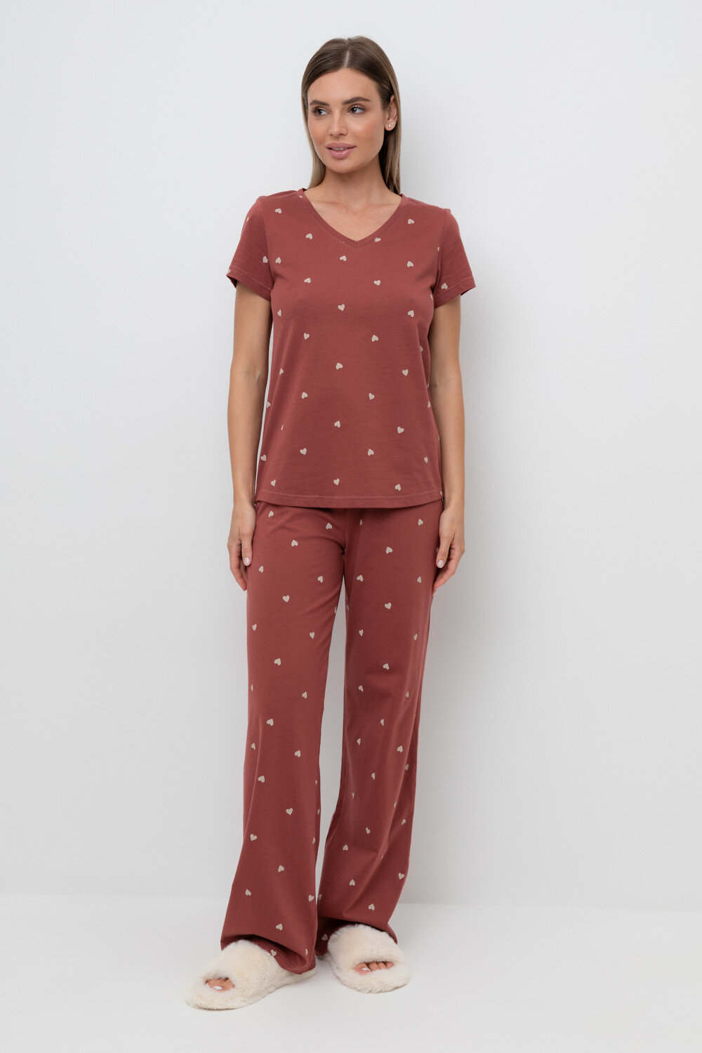 Легкий комплект для комфортного сна и отдыха из натурального хлопка. Футболка с V-образным вырезом комфортно садится по фигуре. Брюки с поясом на резинке выполнены из набивного трикотажа. Гладкий материал приятен к телу и позволяет коже дышать.