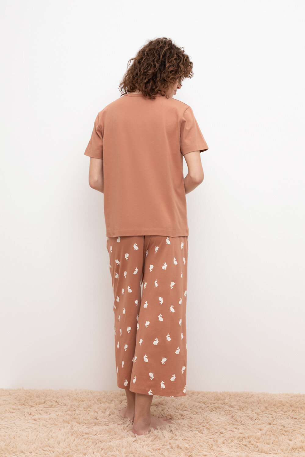 Комплект для сна и отдыха из натурального хлопка с добавлением лайкры. Футболка стандартной длины с принтомкомфортно садится по фигуре. Укороченные просторные брюки с карманами из набивного трикотажа с мягким поясом на резинке.