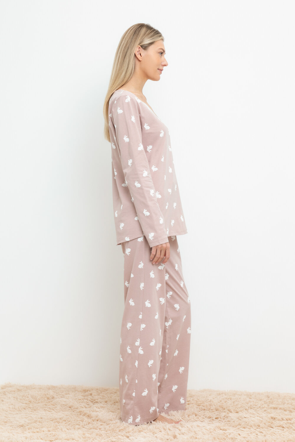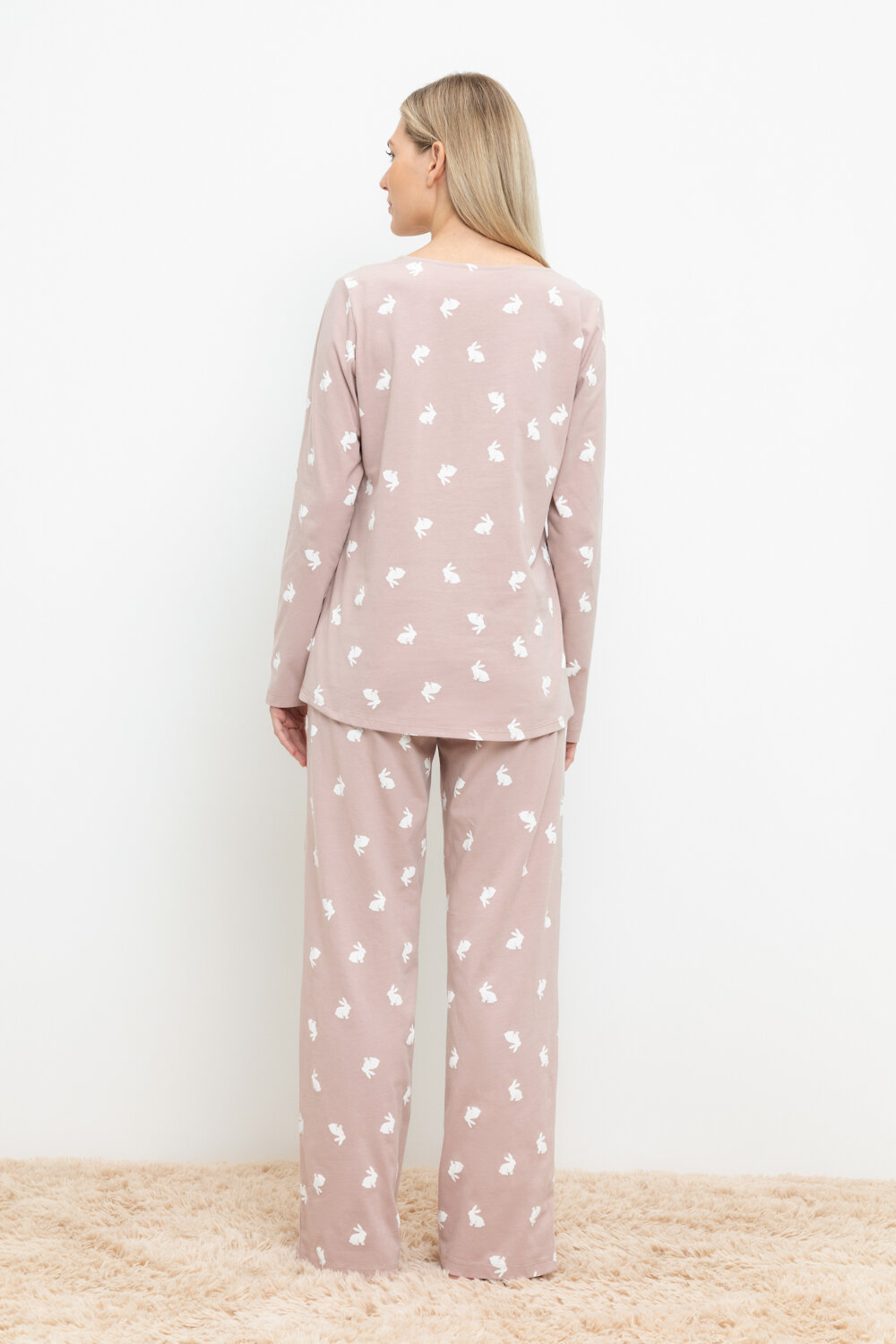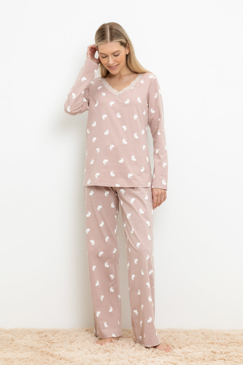 Лёгкий комплект для комфортного сна и отдыха из 100% натурального хлопка. Выполнен из набивного трикотажа с нежным рисунком. Джемпер с длинными рукавами и глубоким V-образным вырезом с мягким кружевом комфортно садится по фигуре. Просторные брюки с мягким поясом на резинке регулируются лентой. Гладкий материал приятен к телу и позволяет коже дышать.