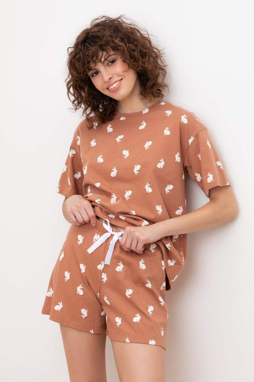 Комплект для комфортного отдыха из набивного трикотажа с нежным рисунком. Футболка с короткими рукавами и спущенной линией плеча комфортно садится по фигуре. Шорты с мягким поясом на резинке. Свободный силуэт не сковывает движения.