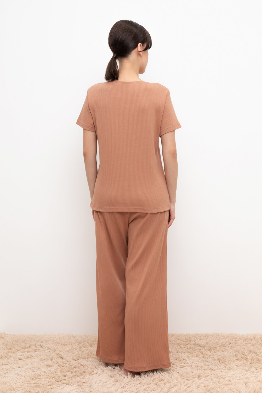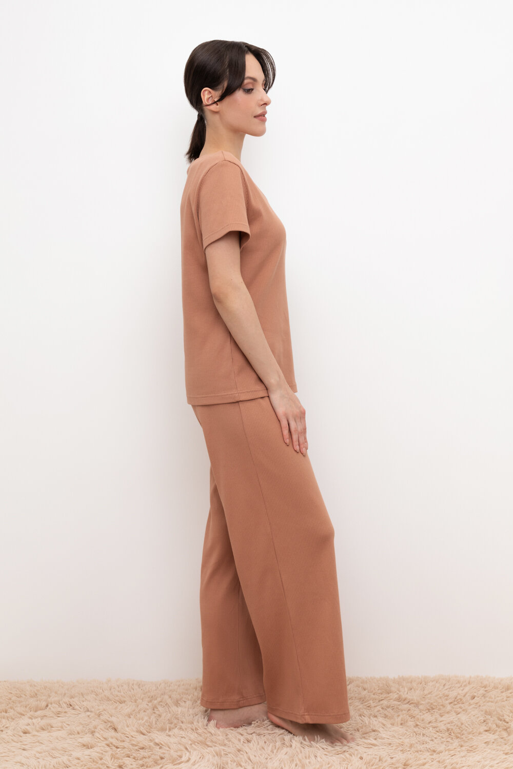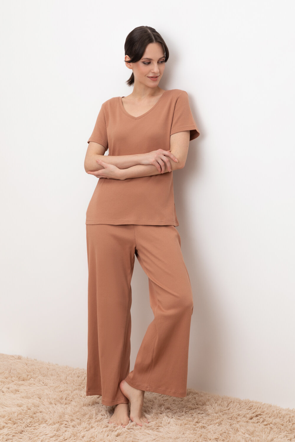 Комплект для комфортного сна и отдыха из трикотажного полотна в рубчик. Свободная футболка с V-образным вырезом. Брюки с мягким поясом на резинке удобно садятся по фигуре.