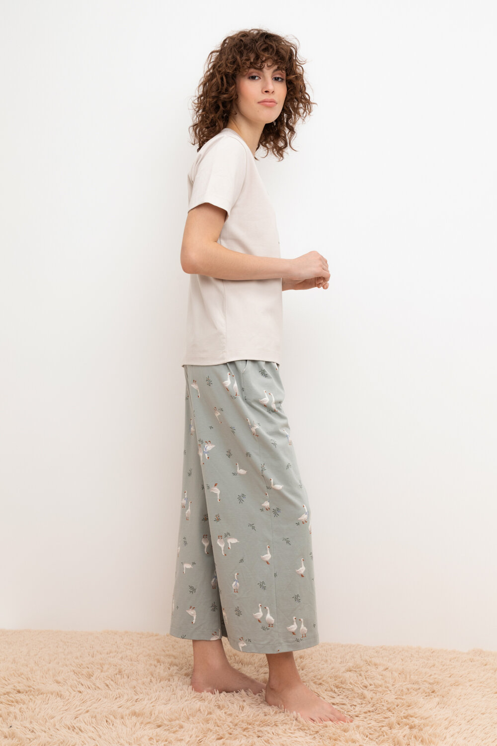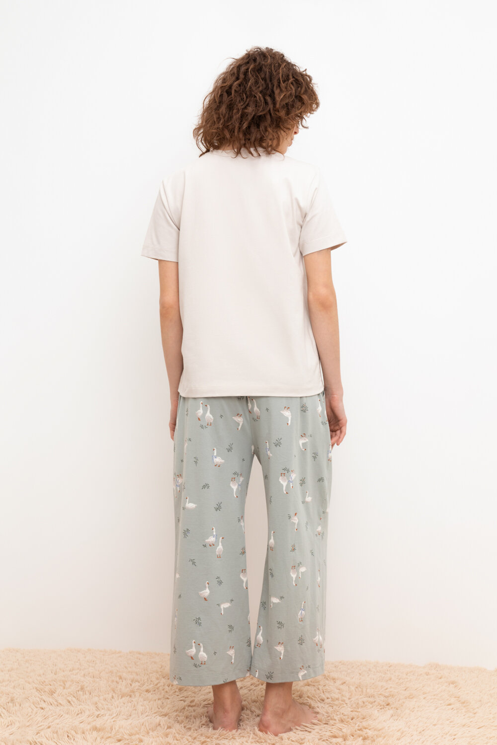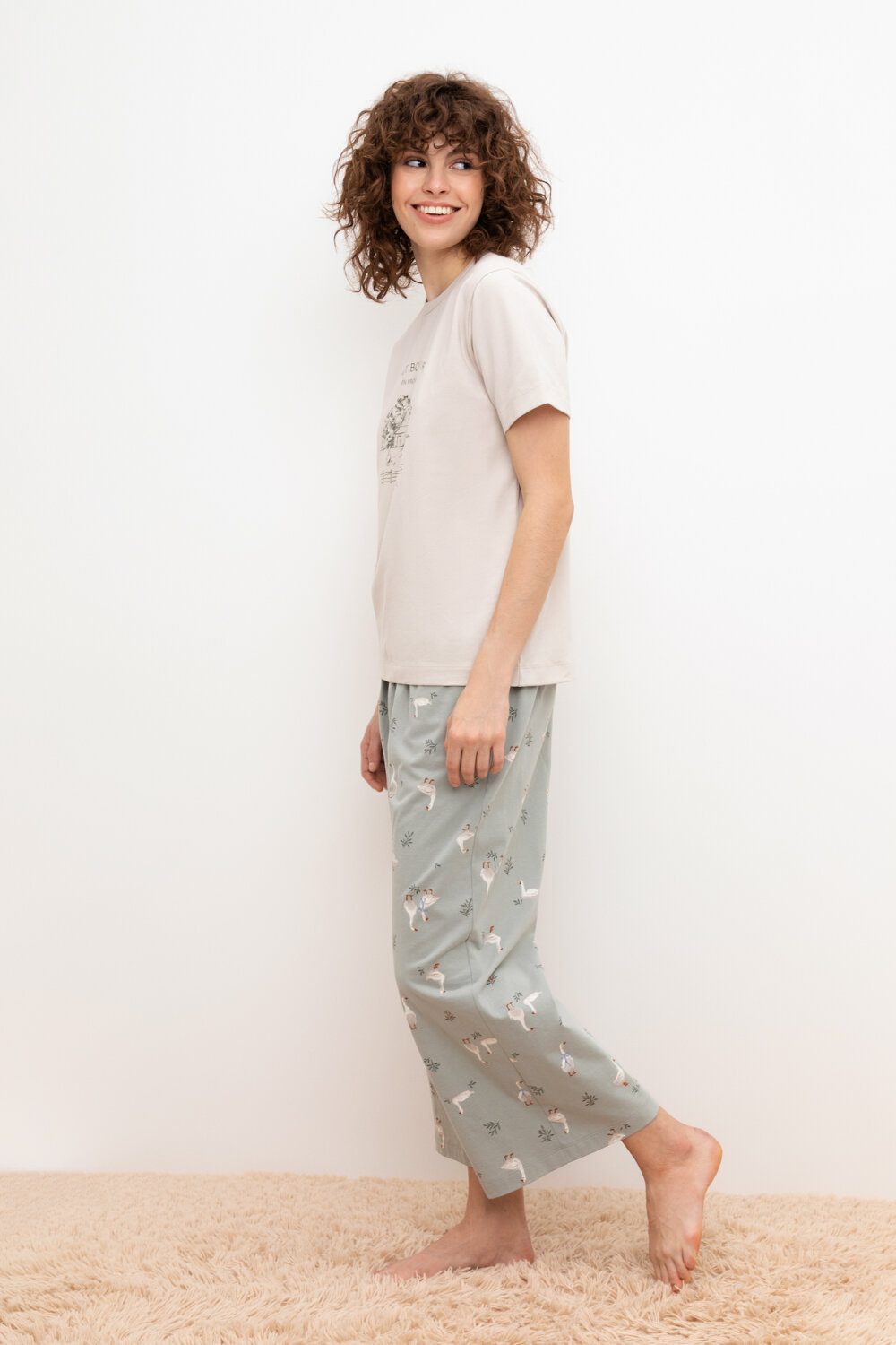Комплект для сна и отдыха из натурального хлопка с добавлением лайкры. Футболка стандартной длины комфортно садится по фигуре. Укороченные просторные брюки с карманами из набивного трикотажа с мягким поясом на резинке.