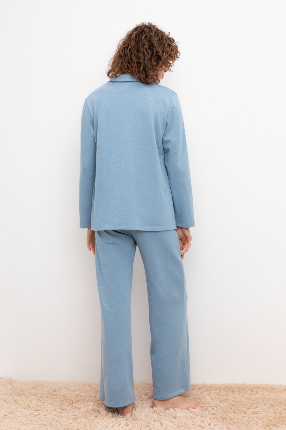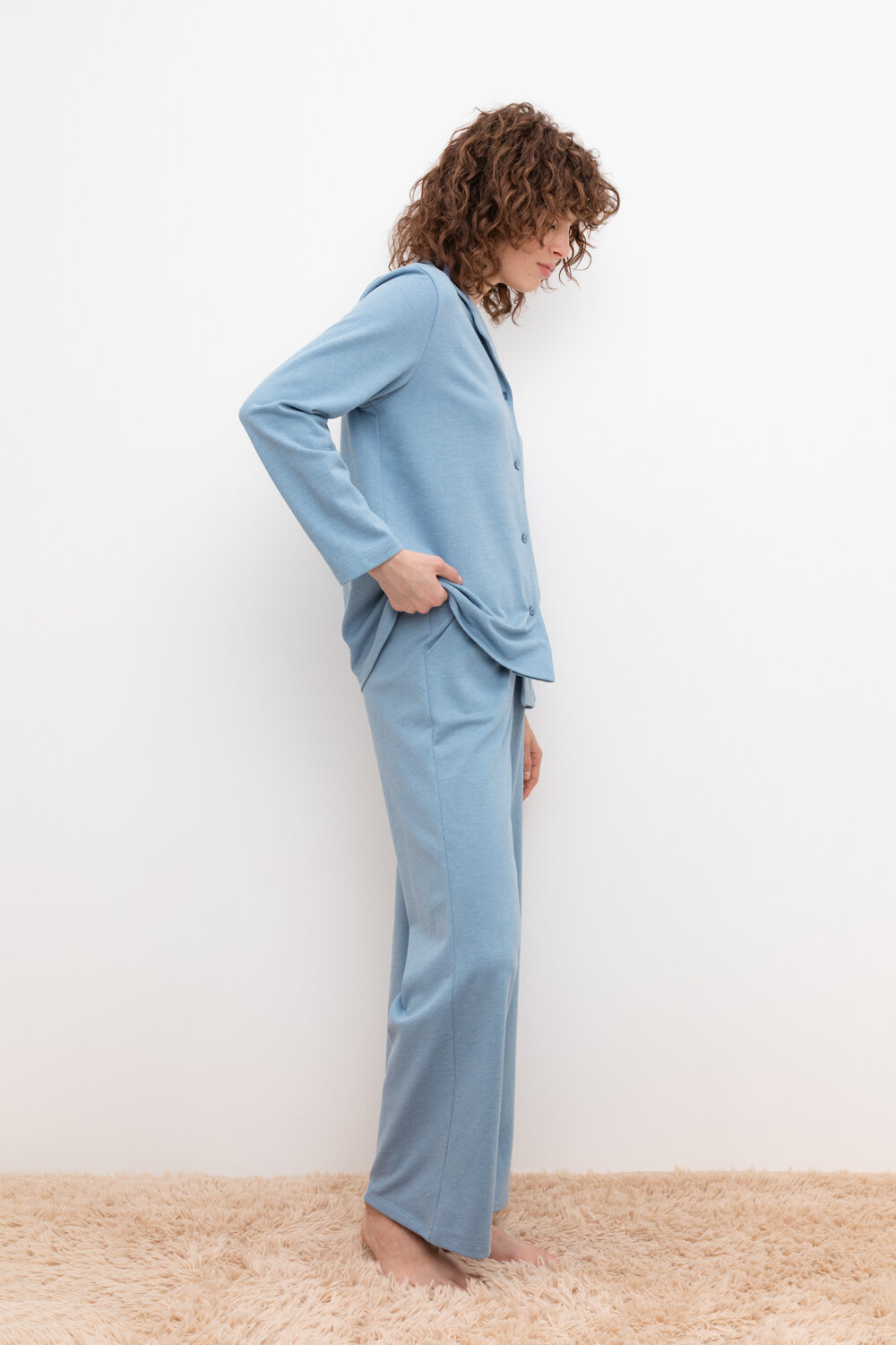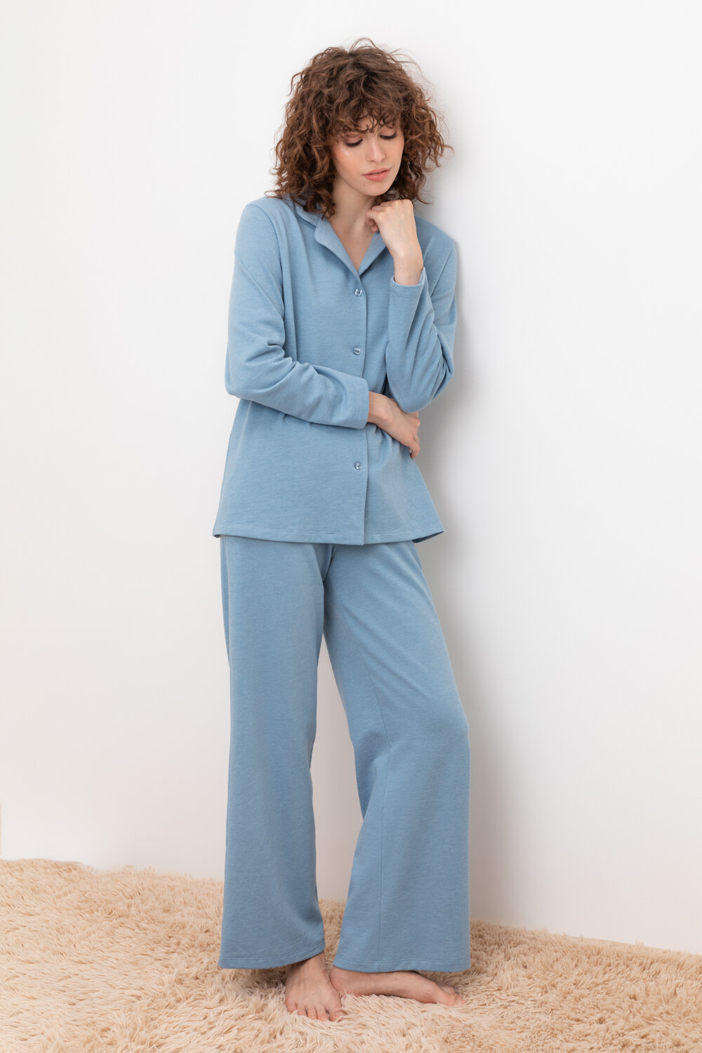 Комплект для комфортного сна и отдыха из однотонного трикотажа с содержанием полиэстера. Рубашка с длинными рукавами на пуговицах. Брюки с мягким поясом на резинке. Гладкий материал приятен к телу, не теряет форму и позволяет коже дышать.