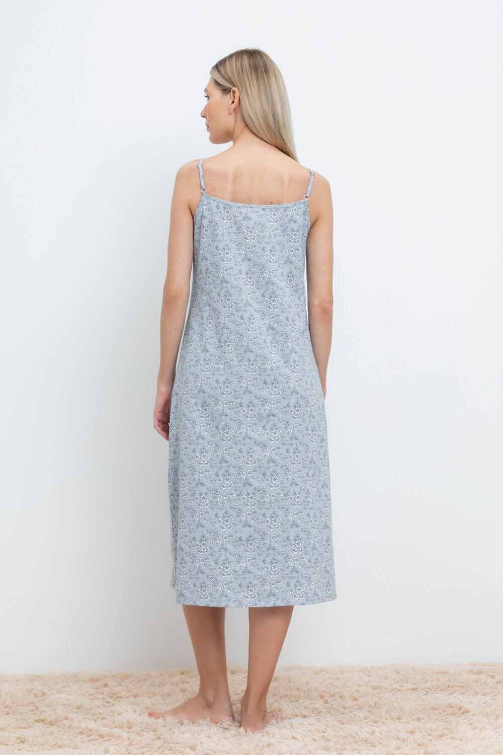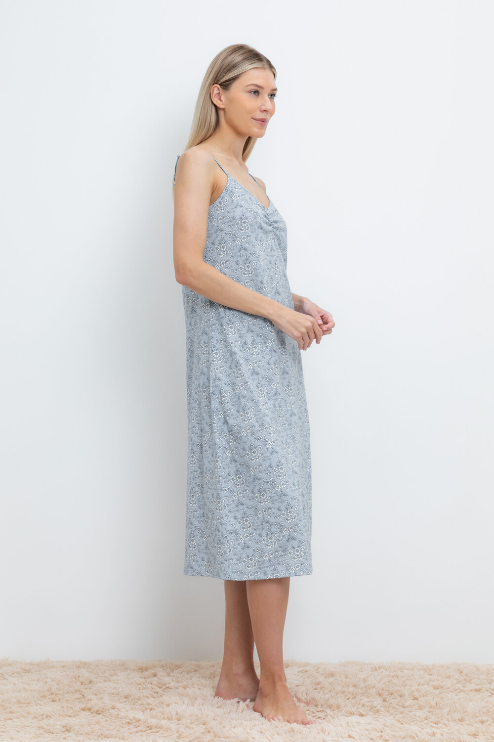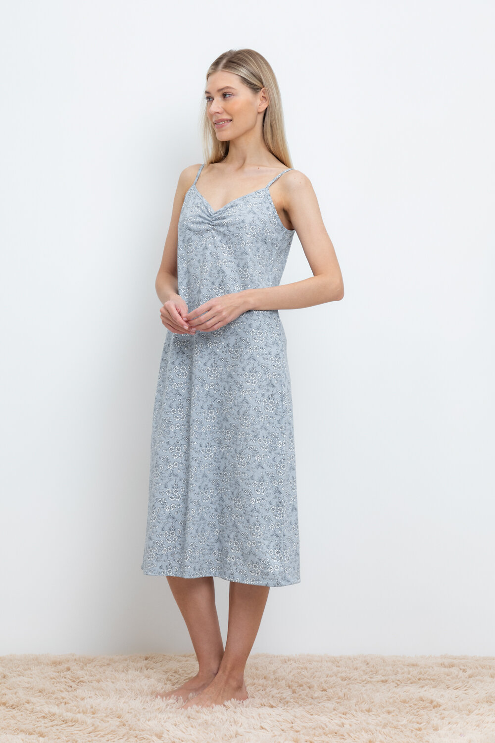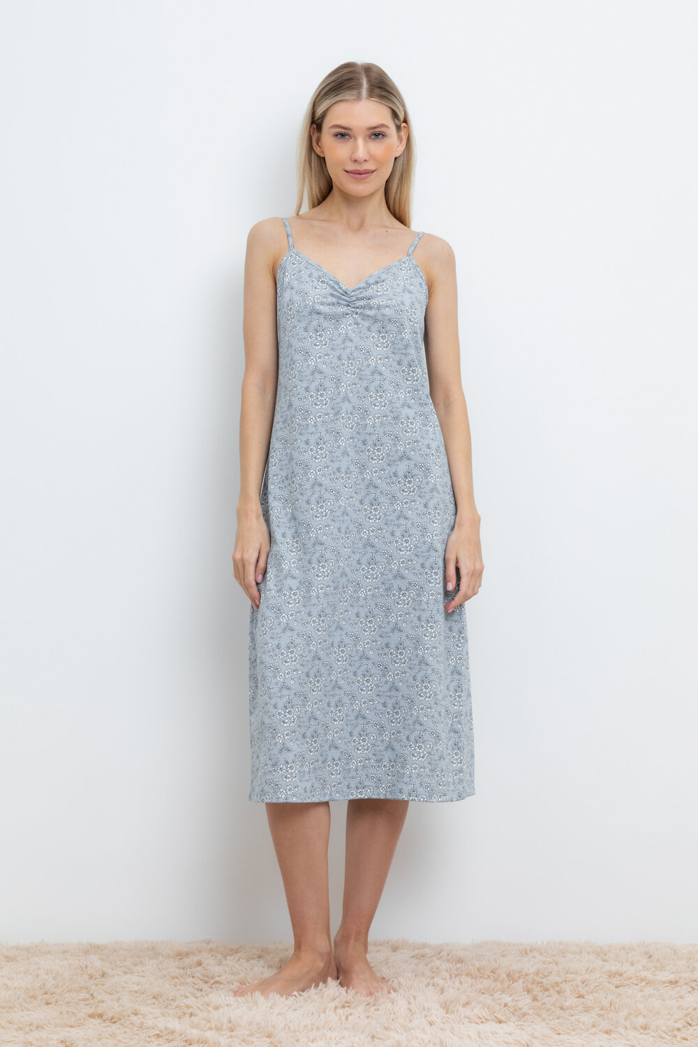 Элегантная сорочка на бретелях из 100% натурального хлопка для комфортного сна. Модель из трикотажного полотна супрем с набивным нежным рисунком с регулируемыми бретелями. На груди сборка. Гладкий материал приятен к телу и позволяет коже дышать.