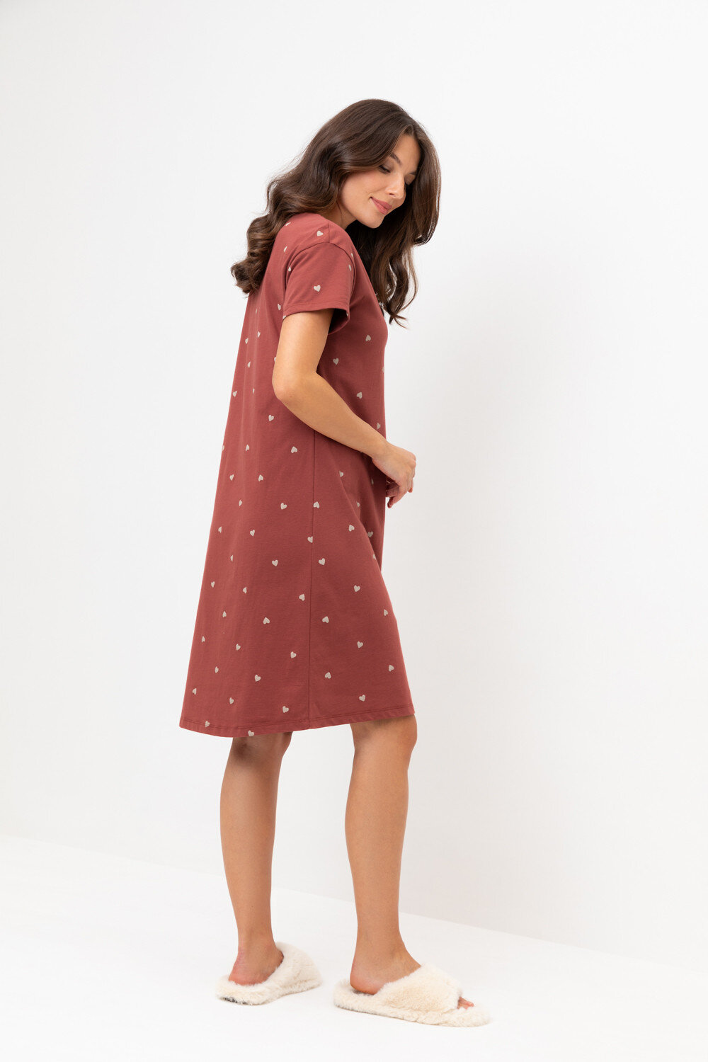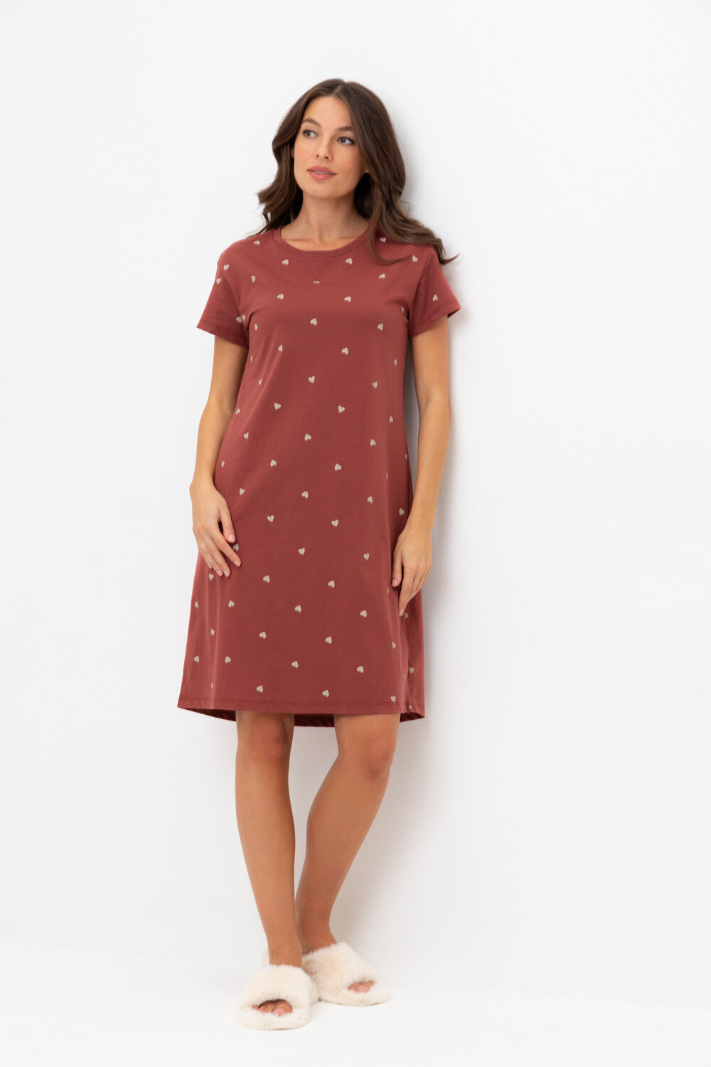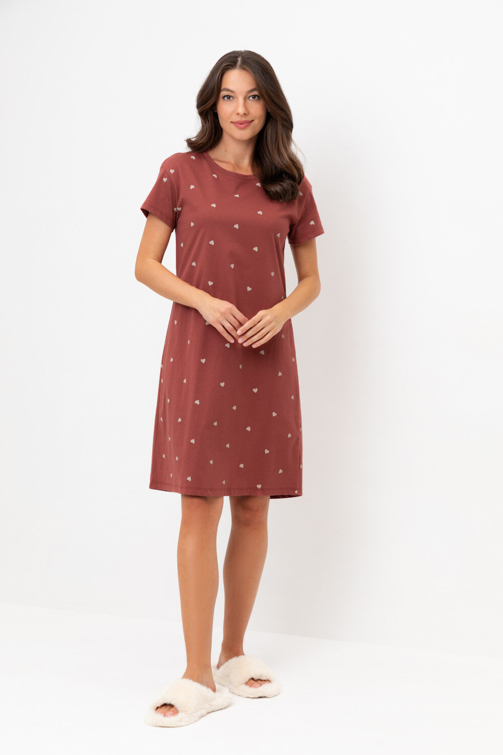 Уютная удлиненная сорочка с короткими рукавами из 100% натурального хлопка. Выполнена из набивного трикотажа супрем с нежным рисунком.