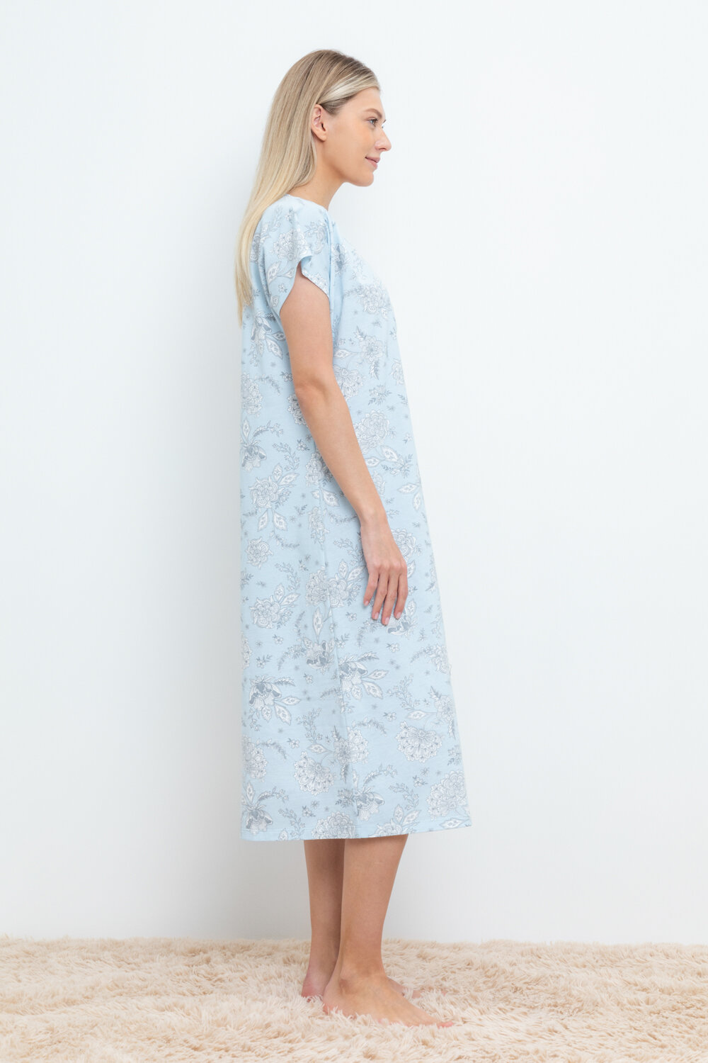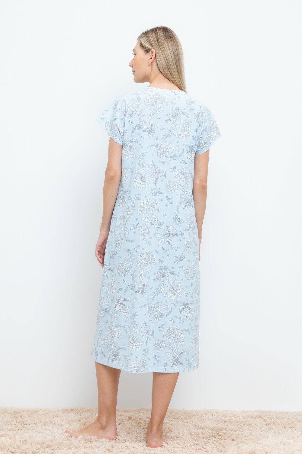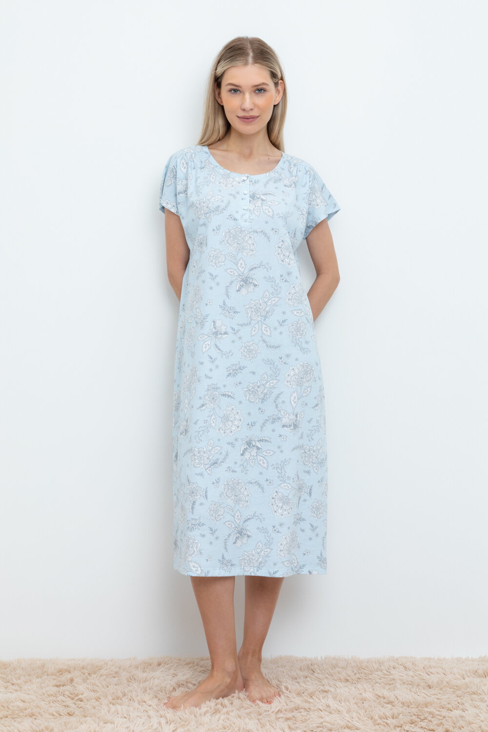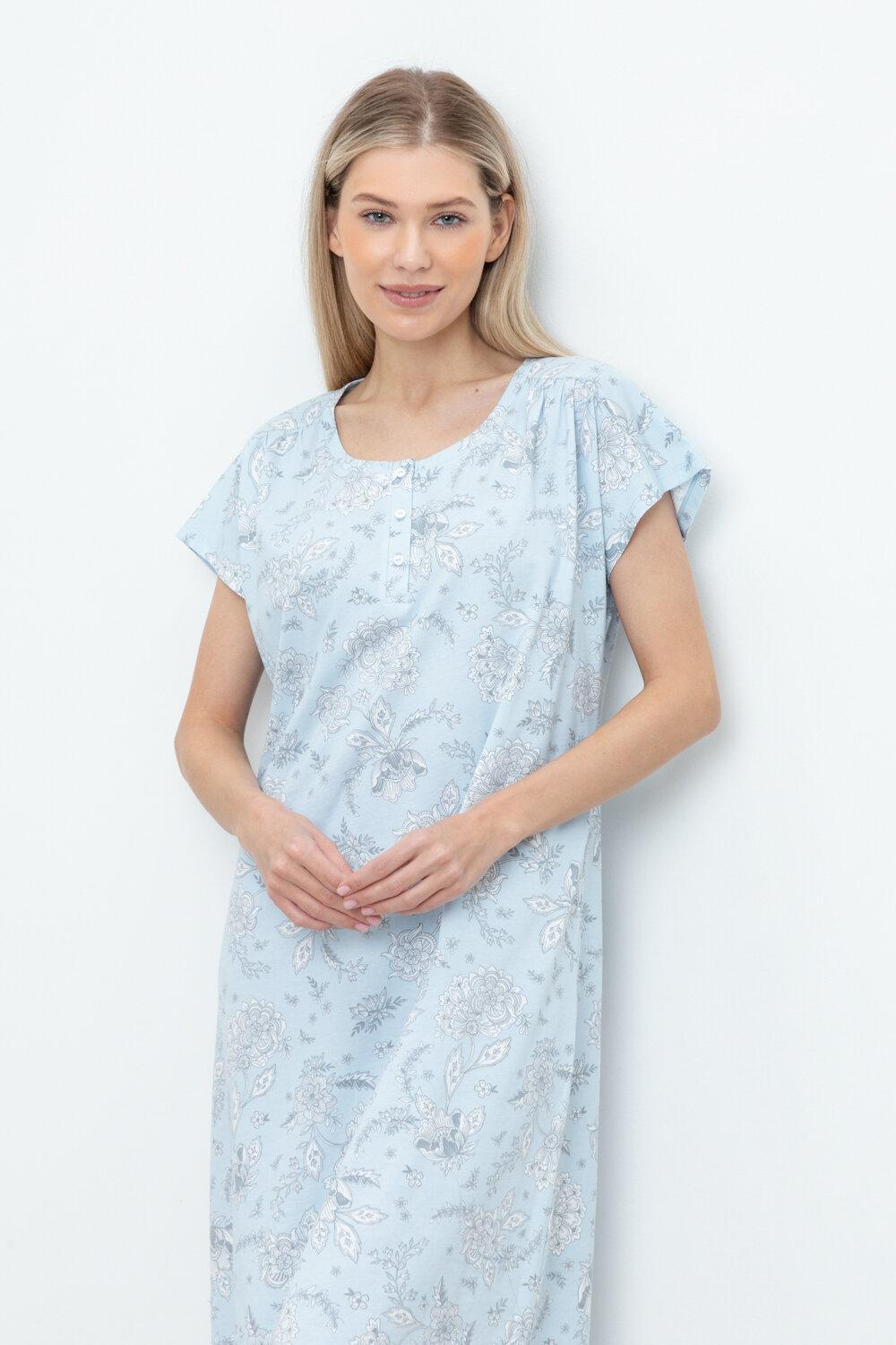 Уютная удлиненная сорочка с короткими рукавами из 100% натурального хлопка. Выполнена из набивного трикотажа супрем с нежным рисунком. На груди застегивается на пуговицы. Все трикотажные полотна производятся в соответствии с нормами Швейцарского сертификата ЭкоТекс. Сделано в России