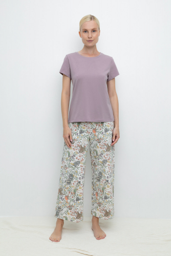 Комплект для комфортного сна и отдыха из трикотажного полотна в рубчик. Свободная футболка с V- образным вырезом. Брюки с мягким поясом на резинке удобно садятся по фигуре.
