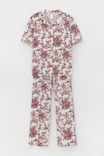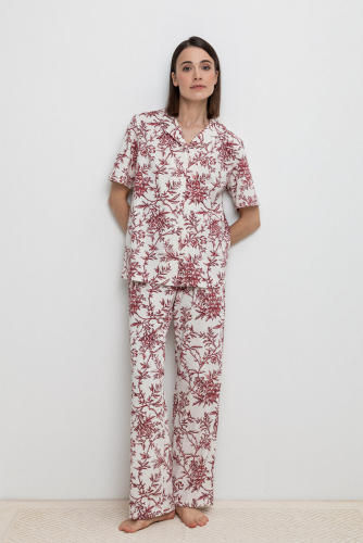 Комплект для комфортного сна из набивного трикотажа с нежным рисунком из 100% натурального хлопка. Рубашка с короткими рукавами на пуговицах . Брюки с мягким поясом на резинке. Гладкий материал приятен к телу, не теряет форму и позволяет коже дышать.