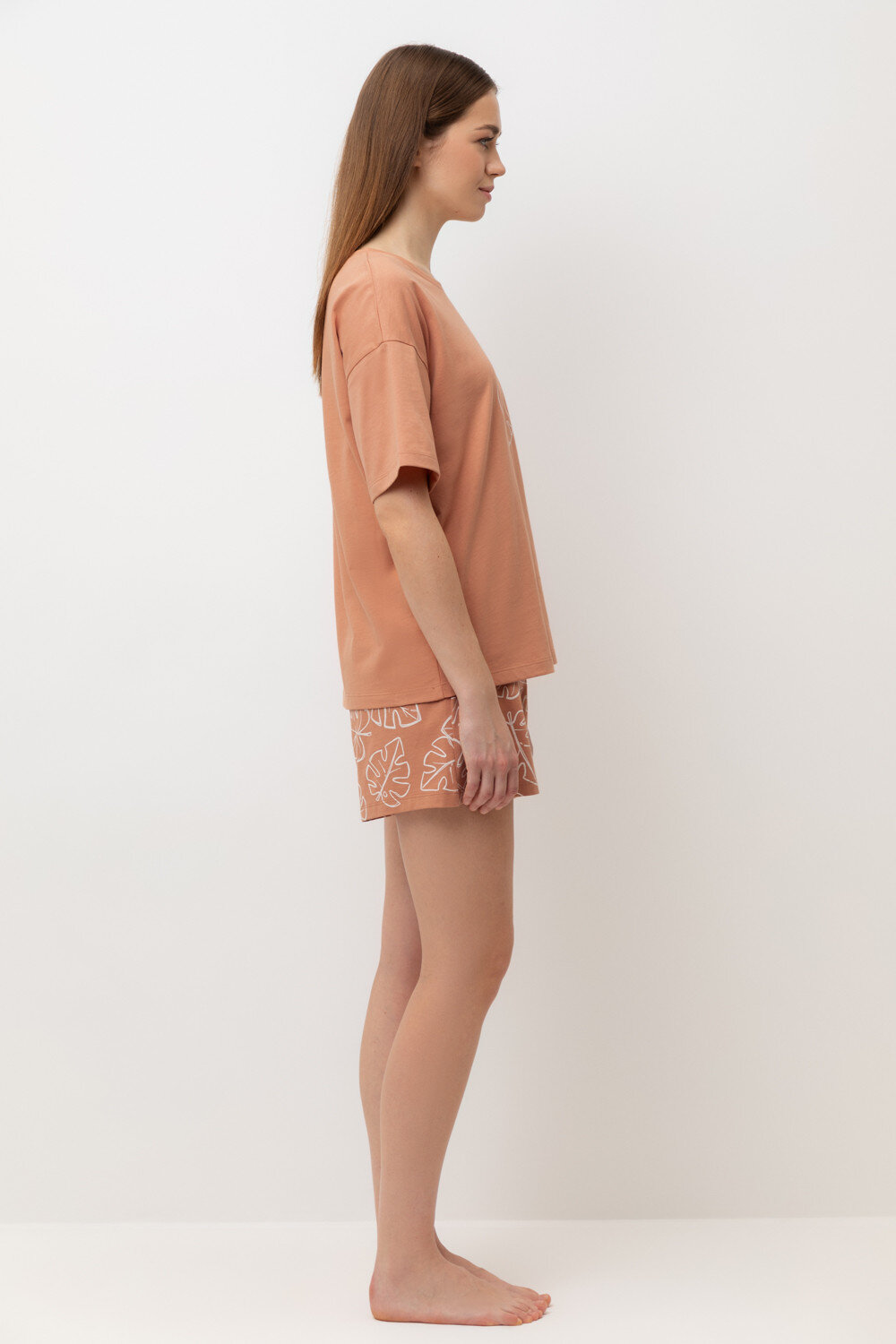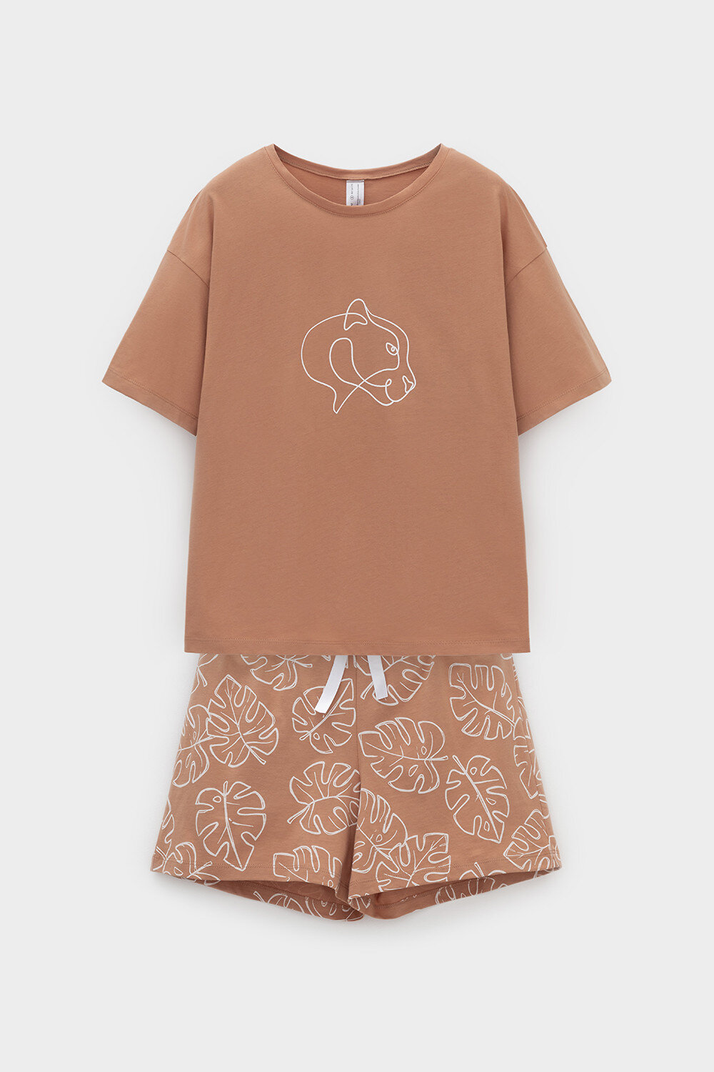 Комплект для комфортного сна и отдыха из трикотажа с нежным рисунком из 100% натурального хлопка. Футболка с короткими рукавами и спущенной линией плеча комфортно садится по фигуре. Шорты с мягким поясом на резинке. В поясе шорт атласная лента. Свободный силуэт не сковывает движения.