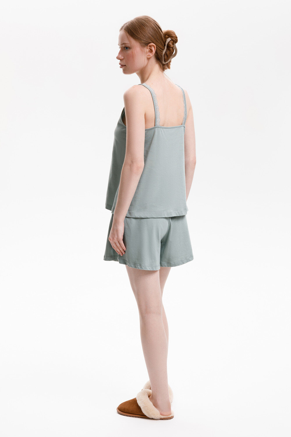 Легкий комплект приглушенного зеленого оттенка выполнен из хлопка с нежнейшим модалом. Свободный крой топа декорированный эластичным кружевом и мягкий пояс шорт обеспечивают легкость и свободу движений.