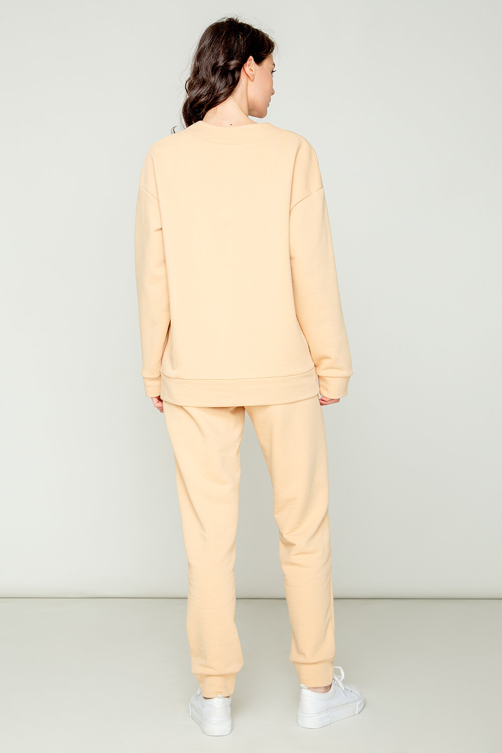 Мягкий однотонный джемпер с V-образным вырезом и длинными рукавами из мягкого петельчатого футер трёхнитка. Воротник, манжеты и пояс выполнены из основного полотна. В составе 80% натурального хлопка и 20% полиэстера, при этом полиэстер ввязан внутрь по особой технологии и не соприкасается с кожей. Свободная посадка и спущенные плечи придают джемперу объём.