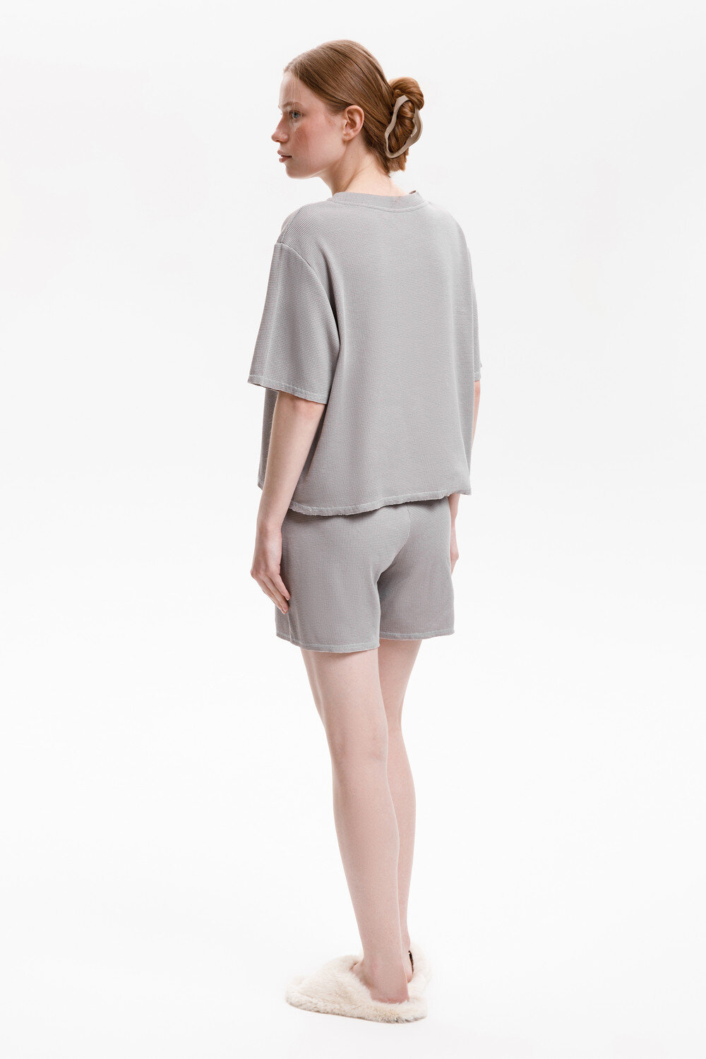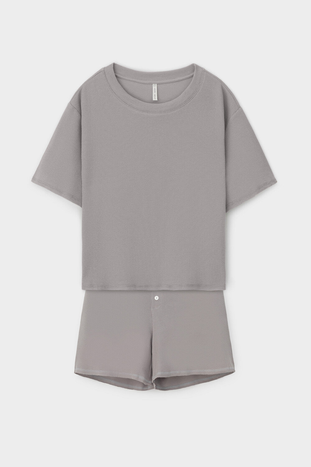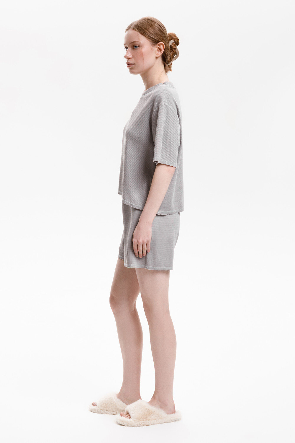 Комплект из объемного трикотажа с добавлением эластичных волокон. Свободный силуэт и мягкий пояс обеспечат комфорт во время сна и отдыха.