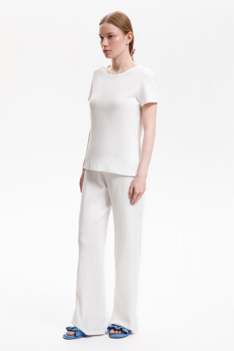 Комплект для сна и отдыха из натурального хлопка. Удлиненная футболка комфортно садится по фигуре. Бриджи из трикотажа с добавлением лайкры с мягким поясом на резинке.